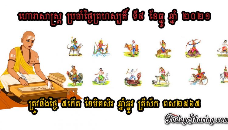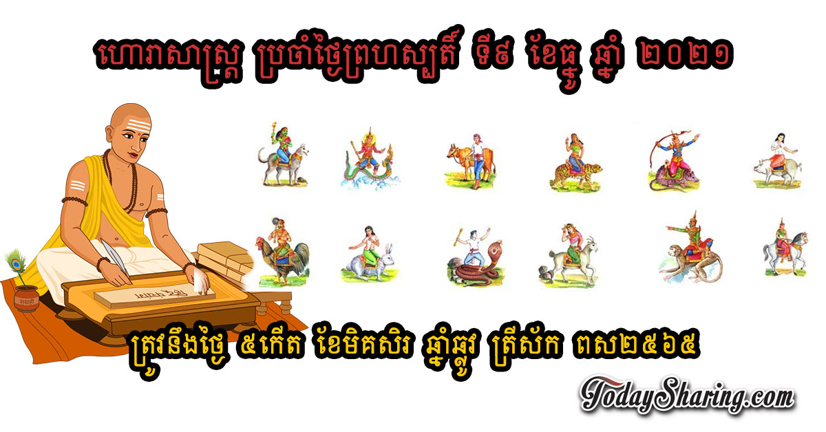 ហោរាសាស្រ្ត ប្រចាំថ្ងៃ ព្រហស្បតិ៍ ទី ០៩ ខែ ធ្នូ ឆ្នាំ ២០២១ ត្រូវនឹងថ្ងៃ ៥កើត ខែមិគសិរ ឆ្នាំឆ្លូវ ត្រីស័ក ពស២៥៦៥