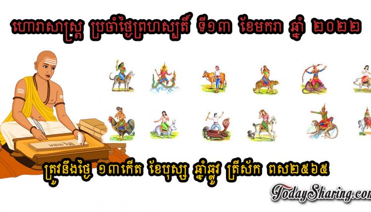 ហោរាសាស្រ្ត ប្រចាំថ្ងៃព្រហស្បតិ៍ ទី១៣ ខែមករា ឆ្នាំ២០២២ ត្រូវនឹងថ្ងៃ ១៣កើត ខែបុស្ស ឆ្នាំឆ្លូវ ត្រីស័ក ពស២៥៦៥