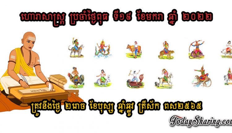 ហោរាសាស្រ្ត ប្រចាំថ្ងៃ ពុធ ទី ១៩ ខែ មករា ឆ្នាំ ២០២២ ត្រូវនឹងថ្ងៃ ២រោច ខែបុស្ស ឆ្នាំឆ្លូវ ត្រីស័ក ពស២៥៦៥