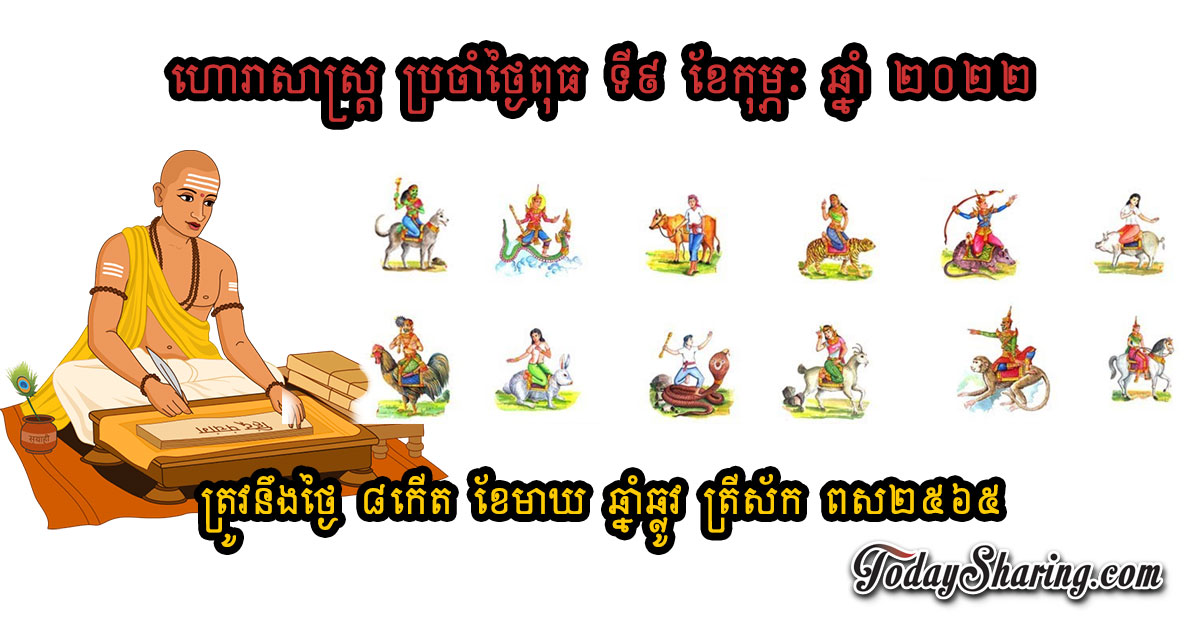 ហោរាសាស្រ្ត ប្រចាំថ្ងៃ ពុធ ទី ០៩ ខែ កុម្ភៈ ឆ្នាំ ២០២២ ត្រូវនឹងថ្ងៃ ៨កើត ខែមាឃ ឆ្នាំឆ្លូវ ត្រីស័ក ពស២៥៦៥