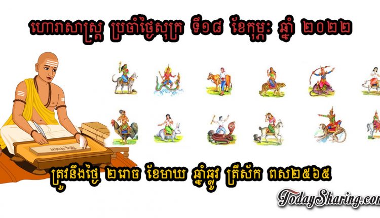 ហោរាសាស្រ្ត ប្រចាំថ្ងៃ សុក្រ ទី ១៨ ខែ កុម្ភៈ ឆ្នាំ ២០២២ ត្រូវនឹងថ្ងៃ ២រោច ខែមាឃ ឆ្នាំឆ្លូវ ត្រីស័ក ពស២៥៦៥
