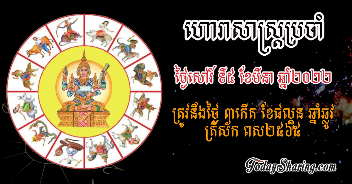 ហោរាសាស្រ្ត ប្រចាំថ្ងៃ សៅរ៍ ទី ០៥ ខែ មីនា ឆ្នាំ ២០២២ ត្រូវនឹងថ្ងៃ ៣កើត ខែផល្គុន ឆ្នាំឆ្លូវ ត្រីស័ក ពស២៥៦៥