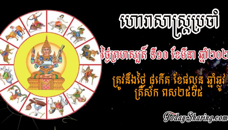 ហោរាសាស្រ្ត ប្រចាំថ្ងៃ ព្រហស្បតិ៍ ទី ១០ ខែ មីនា ឆ្នាំ ២០២២ ត្រូវនឹងថ្ងៃ ៨កើត ខែផល្គុន ឆ្នាំឆ្លូវ ត្រីស័ក ពស២៥៦៥