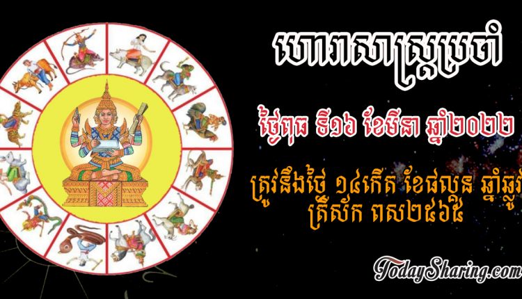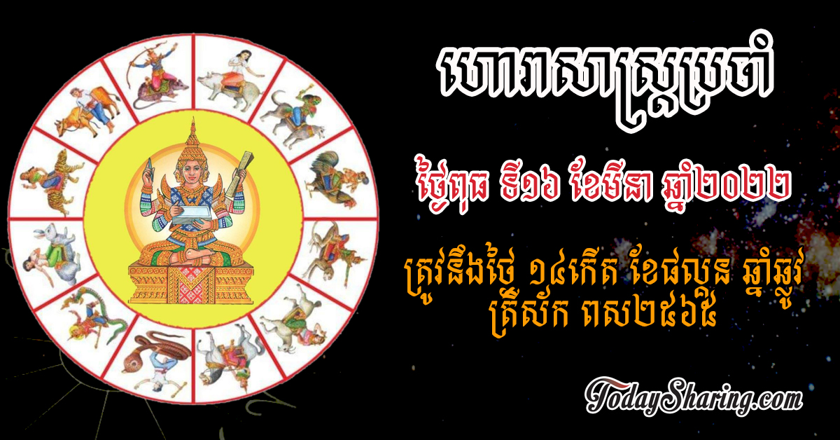 ហោរាសាស្រ្ត ប្រចាំថ្ងៃ ពុធ ទី ១៦ ខែ មីនា ឆ្នាំ ២០២២ ត្រូវនឹងថ្ងៃ ១៤កើត ខែផល្គុន ឆ្នាំឆ្លូវ ត្រីស័ក ពស២៥៦៥
