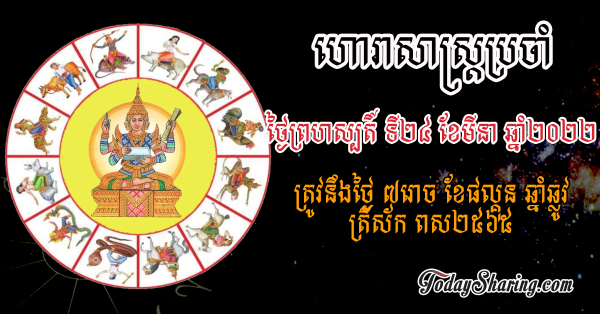 ហោរាសាស្រ្ត ប្រចាំថ្ងៃ ព្រហស្បតិ៍ ទី ២៤ ខែ មីនា ឆ្នាំ ២០២២ ត្រូវនឹងថ្ងៃ ៧រោច ខែផល្គុន ឆ្នាំឆ្លូវ ត្រីស័ក ពស២៥៦៥