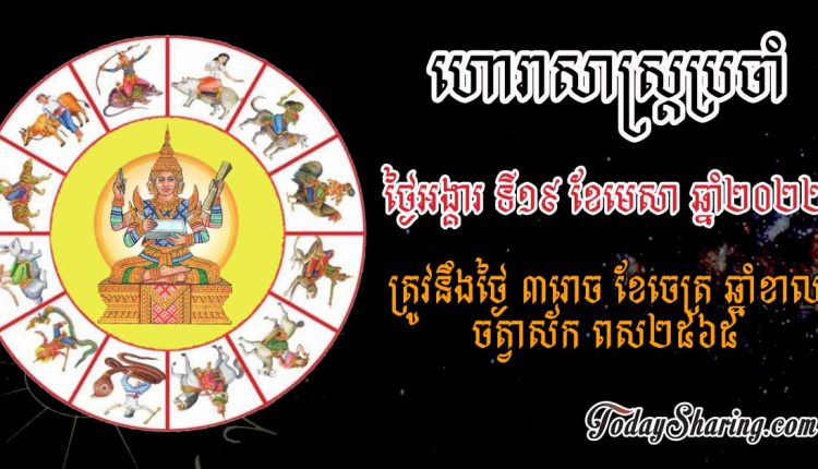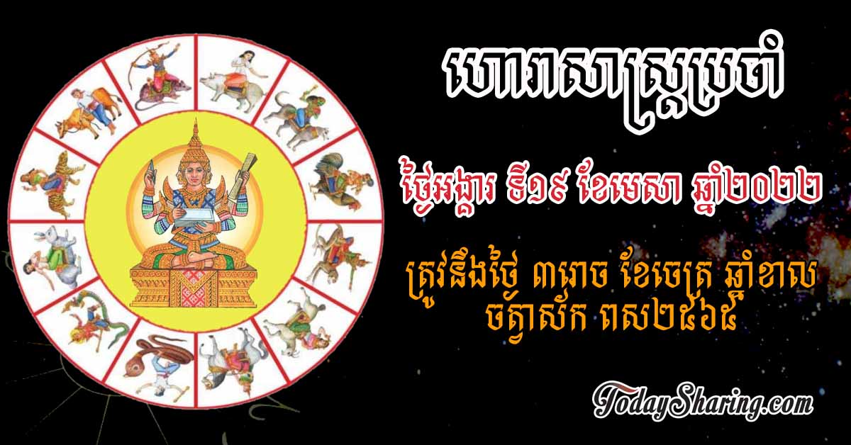 ហោរាសាស្រ្ត ប្រចាំថ្ងៃ អង្គារ ទី ១៩ ខែ មេសា ឆ្នាំ ២០២២ ត្រូវនឹងថ្ងៃ ៣រោច ខែចេត្រ ឆ្នាំខាល ចត្វាស័ក ពស២៥៦៥