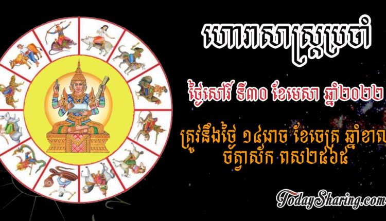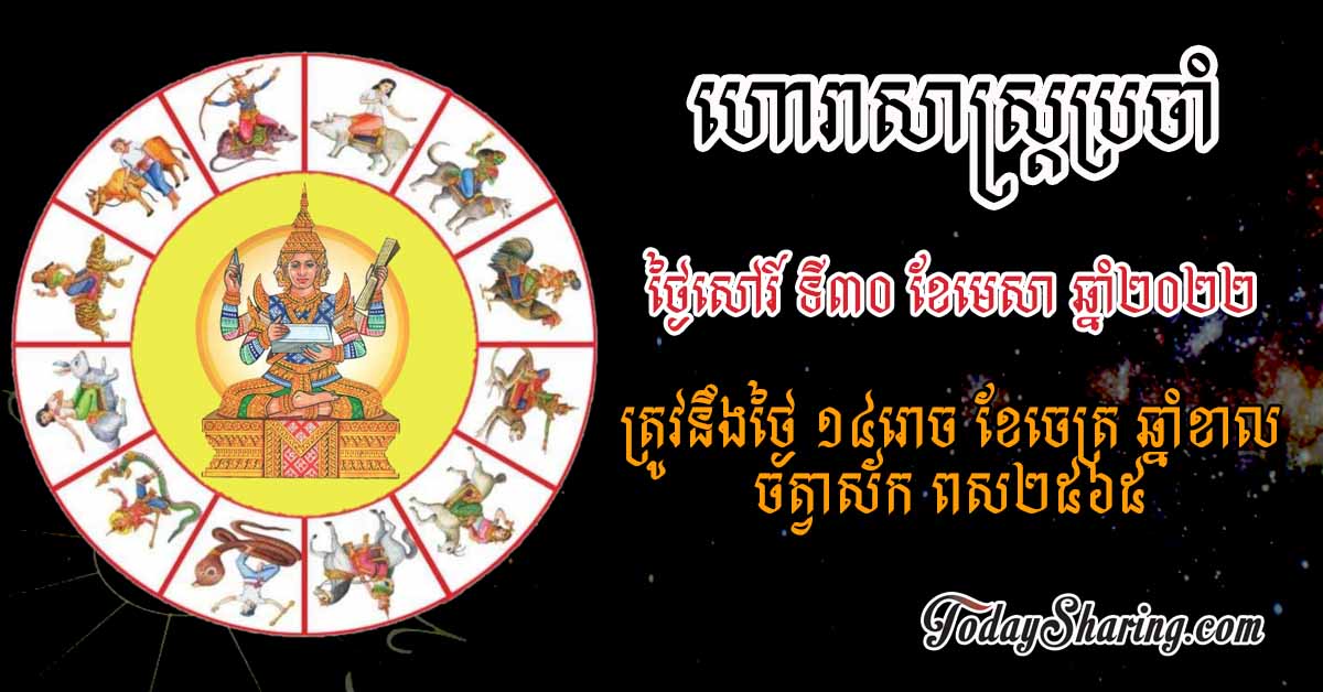 ហោរាសាស្រ្ត ប្រចាំថ្ងៃ សៅរ៍ ទី ៣០ ខែ មេសា ឆ្នាំ ២០២២ ត្រូវនឹងថ្ងៃ ១៤រោច ខែចេត្រ ឆ្នាំខាល ចត្វាស័ក ពស២៥៦៥