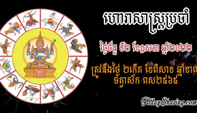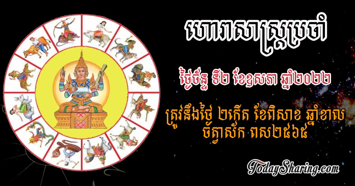 ហោរាសាស្រ្ត ប្រចាំថ្ងៃ ច័ន្ទ ទី ០២ ខែ ឧសភា ឆ្នាំ ២០២២ ត្រូវនឹងថ្ងៃ ២កើត ខែពិសាខ ឆ្នាំខាល ចត្វាស័ក ពស២៥៦៥