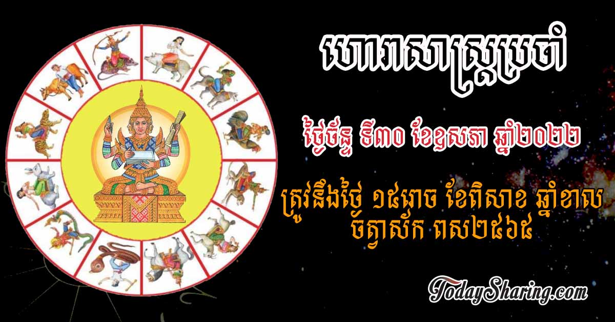 ហោរាសាស្រ្ត ប្រចាំថ្ងៃ ច័ន្ទ ទី ៣០ ខែ ឧសភា ឆ្នាំ ២០២២ ត្រូវនឹងថ្ងៃ ១៥រោច ខែពិសាខ ឆ្នាំខាល ចត្វាស័ក ពស២៥៦៥