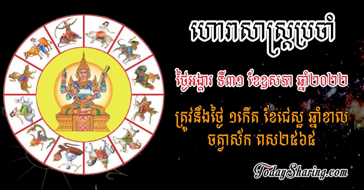 ហោរាសាស្រ្ត ប្រចាំថ្ងៃ អង្គារ ទី ៣១ ខែ ឧសភា ឆ្នាំ ២០២២ ត្រូវនឹងថ្ងៃ ១កើត ខែជេស្ឋ ឆ្នាំខាល ចត្វាស័ក ពស២៥៦៥