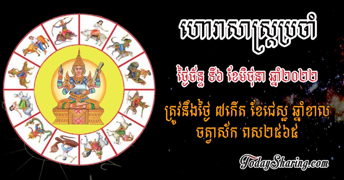 ហោរាសាស្រ្ត ប្រចាំថ្ងៃ ច័ន្ទ ទី ០៦ ខែ មិថុនា ឆ្នាំ ២០២២ ត្រូវនឹងថ្ងៃ ៧កើត ខែជេស្ឋ ឆ្នាំខាល ចត្វាស័ក ពស២៥៦៥