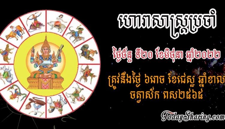 ហោរាសាស្រ្ត ប្រចាំថ្ងៃ ច័ន្ទ ទី ២០ ខែ មិថុនា ឆ្នាំ ២០២២ ត្រូវនឹងថ្ងៃ ៦រោច ខែជេស្ឋ ឆ្នាំខាល ចត្វាស័ក ពស២៥៦៥