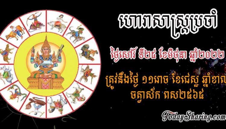 ហោរាសាស្រ្ត ប្រចាំថ្ងៃ សៅរ៍ ទី ២៥ ខែ មិថុនា ឆ្នាំ ២០២២ ត្រូវនឹងថ្ងៃ ១១រោច ខែជេស្ឋ ឆ្នាំខាល ចត្វាស័ក ពស២៥៦៥
