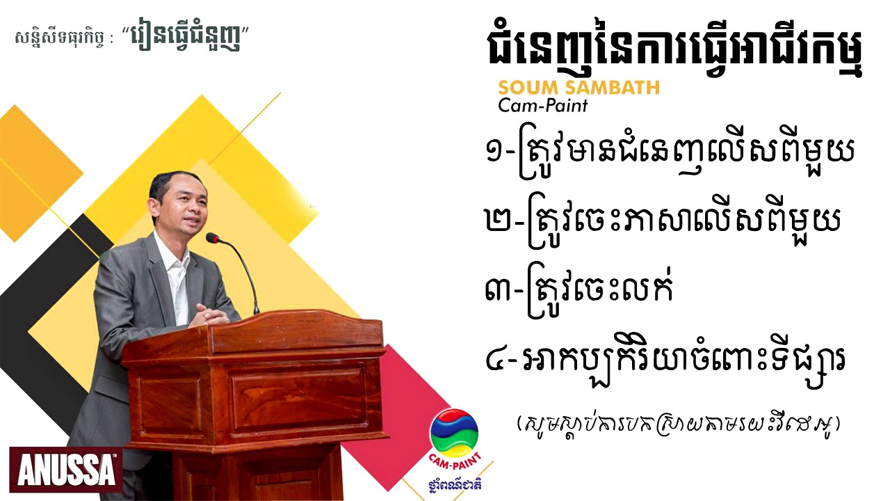 ប៉ុន្តែទន្ទឹមនិងនោះមនុស្សយើងម្នាក់ៗ តែងតែប្រាថ្នាចង់បានការងារមួយដ៏ល្អ ឬក៏អាជីវកម្មមួយដែលអាចជួយអោយជីវិតរបស់យើងអាចរស់នៅស្រួល និងឃ្លាតចាកផុតពីភាពក្រីក្ររ។ បើតាមប្រសាសន៍របស់លោក សោម សម្បត្តិ ដែលជាស្ថាបនិក Campaint ថ្នាំព៌ណជាតិ បានលើកឡើងថា “បើគ្មានចំណេះ អោយមានជំនាញ នោះទើបជីវិតអ្នកអាចជៀសផុតពីភាពក្រីក្រ។