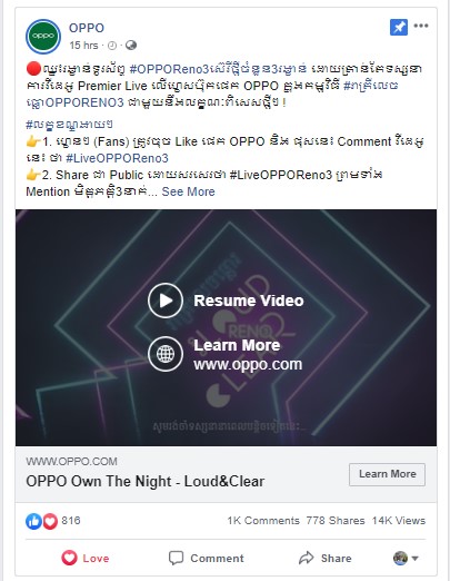 វត្តមាន OPPO Reno3 អ្នកឯកទេសស៊ែលហ្វីជំនាន់ថ្មី តាមរយៈការ  Premiered Live ខ្នាតធំលើកដំបូងបង្អស់ លើបណ្តាញសង្គមហ្វេសប៊ុក OPPO និង សារព័ត៌មានល្បីៗយ៉ាងច្រើនសន្ធឹកសន្ធាប់ នៅក្នុងព្រះរាជាណាចក្រកម្ពុជា បានទាក់ទាញនិងផ្អើល អ្នកលេងហ្វេសប៊ុក ចូលរួមទស្សនារាប់ម៉ឺននាក់ ដើម្បីអ៊ុតមើល បច្ចេកវិទ្យាថ្មីៗ រូបរាង និង សមត្ថភាពពិតរបស់វា។