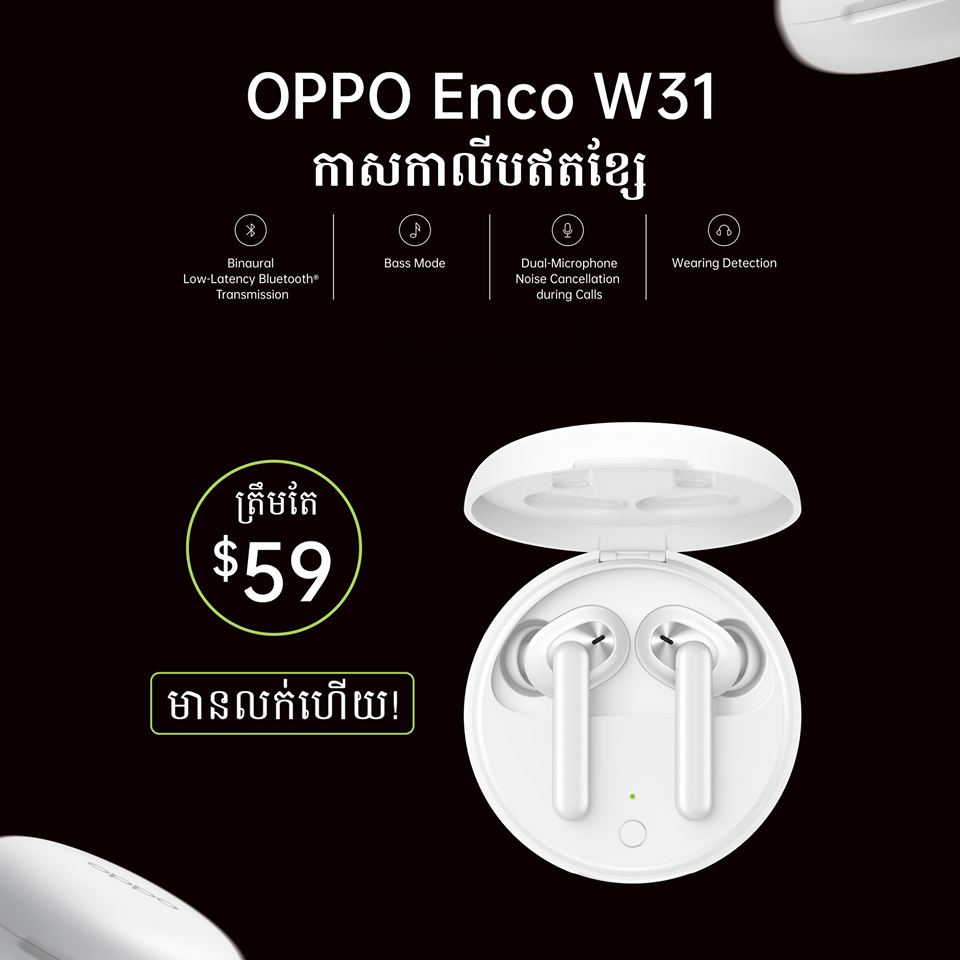 ភ្នំពេញ៖ ក្រុមហ៊ុន OPPO ដាក់លក់ទូរស័ព្ទពេញនិយមស៊ែលហ្វីសាហាវ OPPO Reno3 កាមេរ៉ាមុខទំហំធំជាងគេរហូត 44MP តម្លៃ $359 និង OPPO Reno3 Pro កាមេរ៉ភ្លោះមុខទម្លុះអេក្រង់ទំហំ 44MP+2MP តម្លៃ $599 ពិសេសក៌បើកលក់កាសកាលីបឥតខ្សែ OPPO Enco W31 តម្លៃត្រឹមតែ $59 ចាប់ពីថ្ងៃទី02 មេសានេះតទៅ ដើម្បីបំពេញតម្រូវការអតិថិជន ពិសេសជិតដល់រដូវចូលឆ្នាំថ្មីដែលខិតជិតចូលមកដល់។