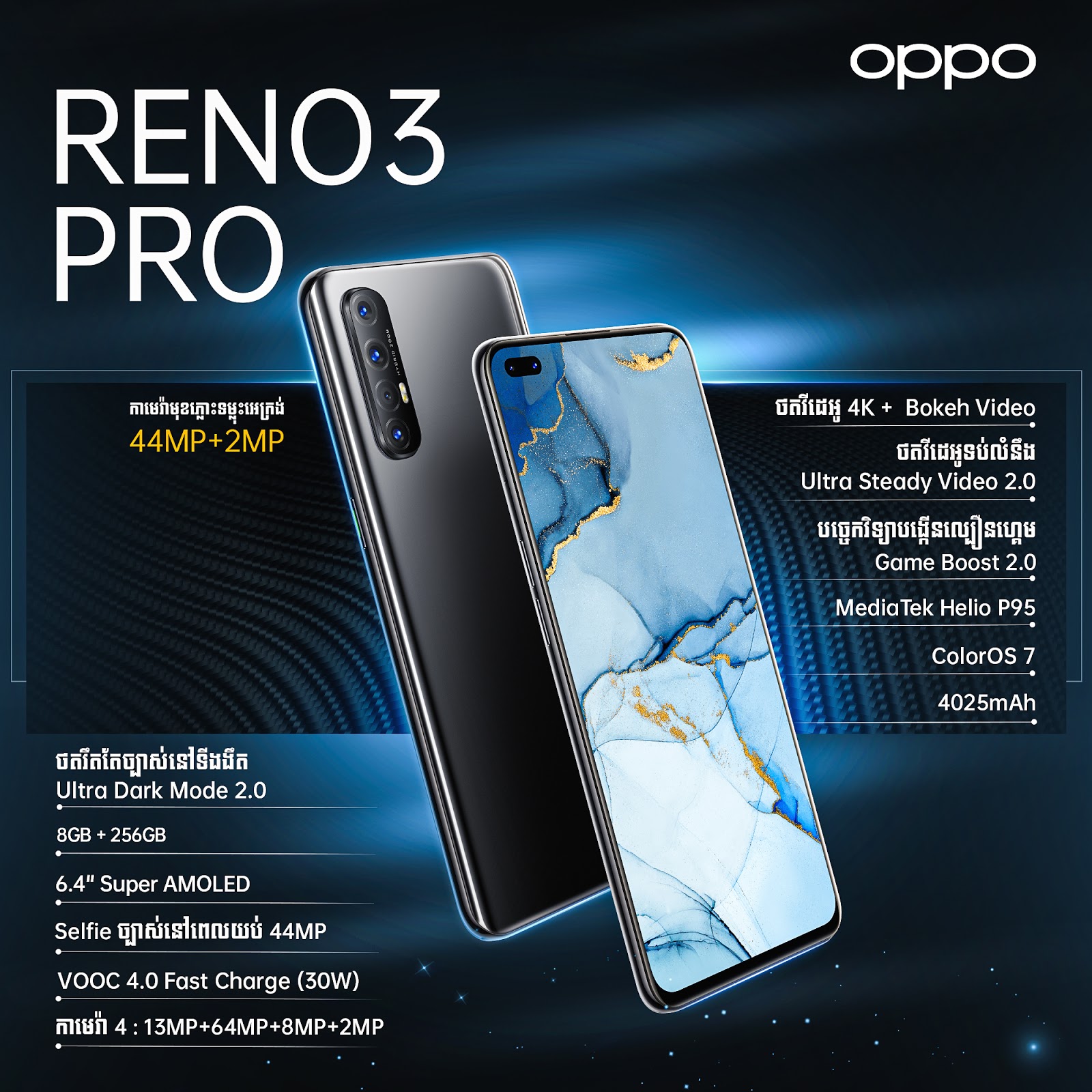 ប្រពា្ញប់រួសរាន់ឡើង ទាន់មានកាដូក៌ច្រើន តម្លៃក៌ល្អ ជាមួយនឹងលក្ខណៈពិសេសថ្មីៗក៌សំបូរបែប ថតរូបទាំងកាមេរ៉ា ទាំងកាមេរ៉ាក្រោយក៌សាហាវ រកឯណាបាន គឺមានតែសំណព្វចិត្ត OPPO Reno 3 ឬReno 3 Pro យើងហ្នឹង?