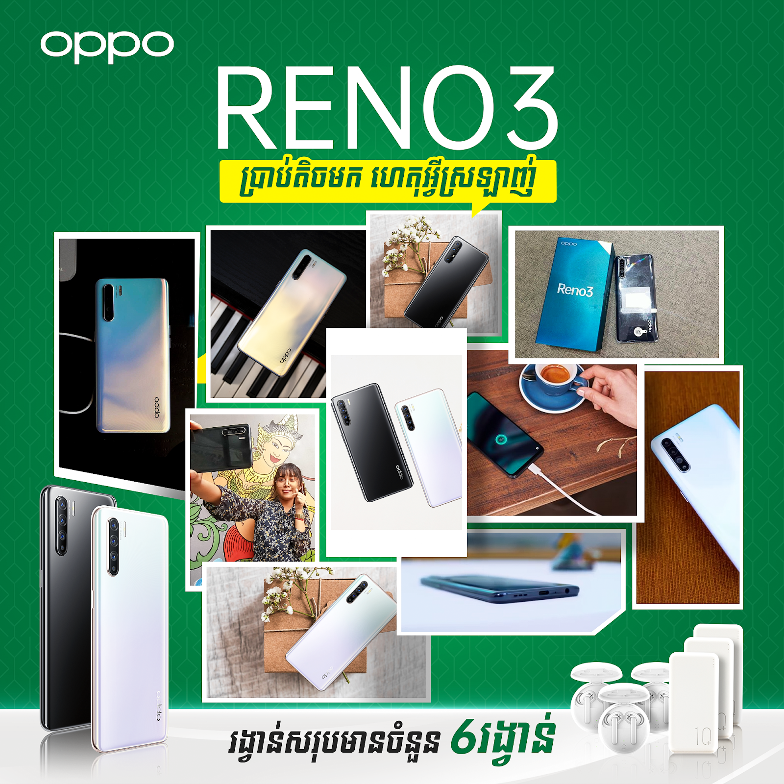 ប្រពា្ញប់រួសរាន់ឡើង ទាន់មានកាដូក៌ច្រើន តម្លៃក៌ល្អ ជាមួយនឹងលក្ខណៈពិសេសថ្មីៗក៌សំបូរបែប ថតរូបទាំងកាមេរ៉ា ទាំងកាមេរ៉ាក្រោយក៌សាហាវ រកឯណាបាន គឺមានតែសំណព្វចិត្ត OPPO Reno 3 ឬReno 3 Pro យើងហ្នឹង?