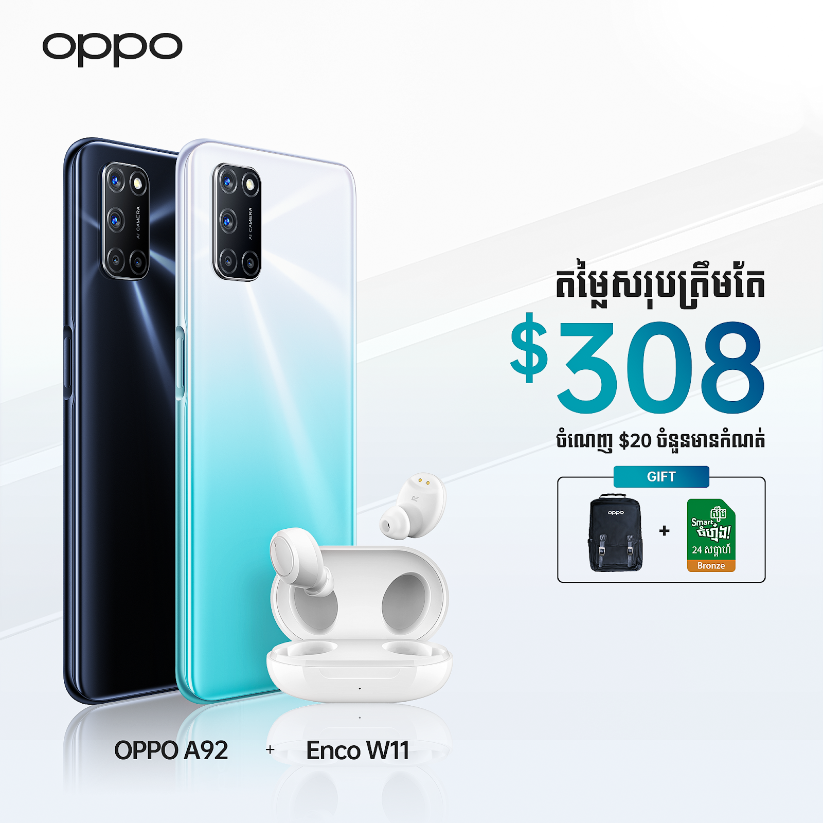OPPO A92 ពិតជាមិនធម្មតាដោយកំពុងទទួលបានការគាំទ្រខ្លាំងជាមួយនឹងលក្ខណៈពិសេសៗ និងលំដាប់ A គ្រប់ពេល គឺមានតម្លៃត្រឹមតែ 279ដុល្លារប៉ុណ្ណោះ។ ដូច្នេះសម្រាប់អតិថិជនដែលមានចំណាប់អារម្មណ៍ អាចធ្វើការកក់ទុកមុនបានចាប់ពីថ្ងៃនេះរហូតដល់ថ្ងៃទី 30 ខែមិថុនា ដល់ 04 ខែកក្កដា 2020 ដើម្បីក្លាយជាម្ចាស់របស់ស្មាតហ្វូនស៊េរី OPPO A92 នេះជាមួយនឹងកពា្ចប់កាដូដ៏ច្រើនលំដាប់ A ផងដែរ។ ពោលគឺ កាដូសរុបមានតម្លៃរហូតដល់ 120ដុល្លារ រួមមាន កាតាប OPPO ស្ពាយពីក្រោយបែបយុវវ័យដ៏ស្រស់ស្អាត ស៊ីមកាតស្មាត