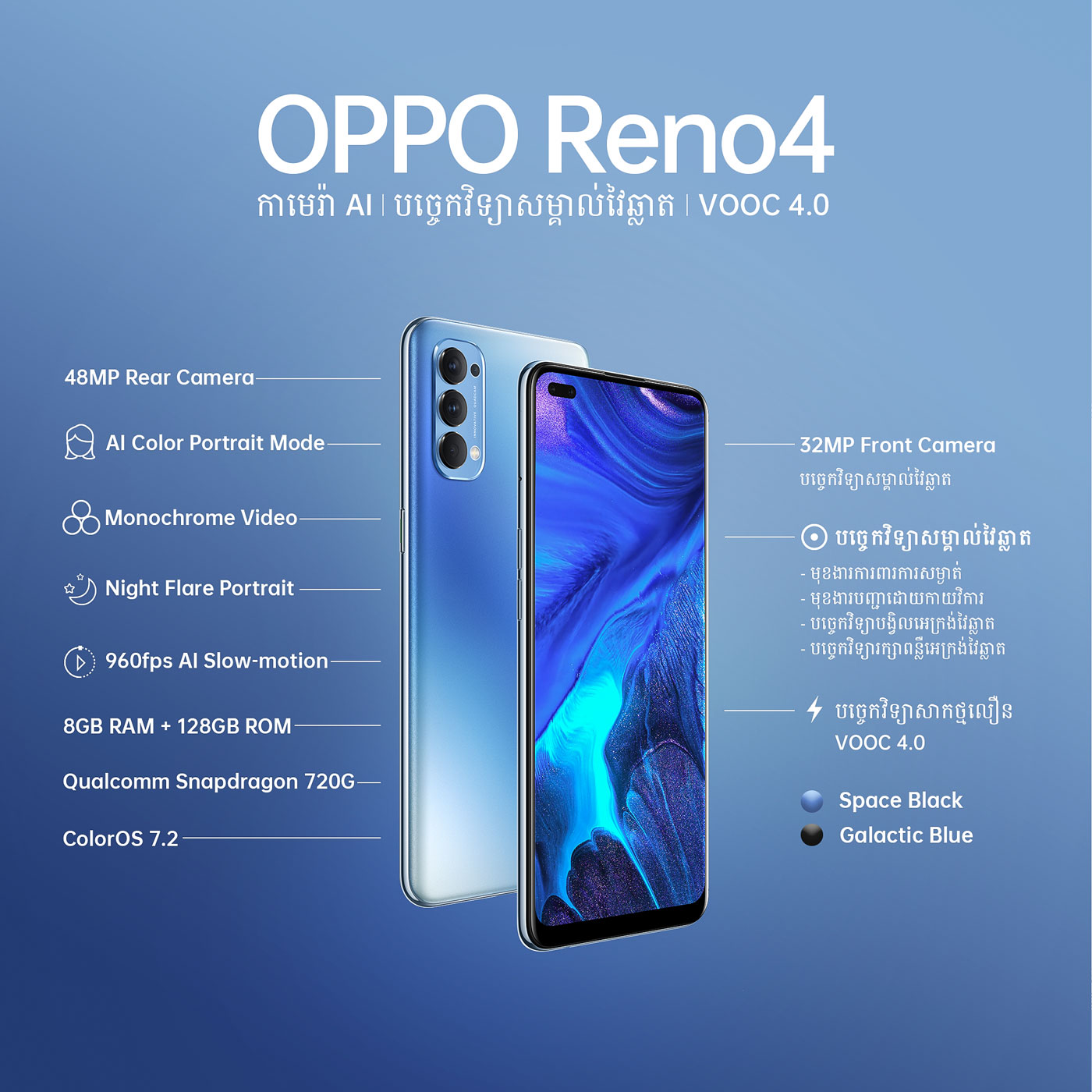 មានឆ្ងល់អត់ថា ហេតុអ្វីបានជា OPPO Reno4 ល្បីរន្ទី ហើយមានអ្វីពិសេសៗខ្លះ? ជាការពិតណាស់ លោកអ្នកអាចរីករាយគ្រប់ពេលជាមួយ OPPO Reno4 កាន់មានភាពភាពលេចធ្លោ រូបរាងស្រឡូន ព្រមទាំងបានបំពាក់មកជាមួយនឹងមុខងារ AI Camera ថ្មីៗ និងបច្ចេកវិទ្យាទំនើបៗដូចជាមុខងារ AI Portrait Color រក្សាពណ៌មនុស្ស ជម្រុះពណ៌ផ្ទៃខាងក្រោយទៅជាសខ្មៅ ដើម្បីឲ្យពណ៌មនុស្សកាន់តែមានភាពលេចធ្លោ។ មុខងារ Monochrome Video ដែលថតយកសកម្មភាពជាមួយភាពច្នៃប្រឌិតប្លែកពីគេ ជាពិសេសសម្រាប់អ្នកចូលចិត្តថតវីដេអូ ឬថត Vlog ជាដើម។ មុខងារថតវីដេអូយឺតៗកម្រិត 960fps AI show-motion បង្ហាញសកម្មភាពលេចធ្លោរបស់អ្នកគ្រប់ប្លង់ គ្រប់ជំហាន ព្រមទាំងចាប់យករាល់សកម្មភាពបានរហ័សរហូតដល់ទៅ 960 ប្លង់ក្នុងមួយវីនាទី (960fps) ឯណ្ណោះ។ មិនតែប៉ុណ្ណោះ OPPO Reno4 ក៏មានមុខងារផ្សេងៗទៀតដូចជា Ultra Dark Mode, Ultra Night Mode, Ultra Clear 108MP ពិសេសថតរូប ឬវីដេអូ Bokeh ទាំងកាមេរ៉ាមុខ និងក្រោយ ច្បាស់មុខព្រាលក្រោយ។ OPPO Reno4 ក៏បានបំពាក់បច្ចេកវិទ្យាថ្មីគឺ AI-enhanced Smart sensor គឺជាបច្ចេកវិទ្យាសម្គាល់វៃឆ្លាតរួមមាន មុខងារការពារការសម្ងាត់ ដែលមិនឲ្យអ្នកជិតខ្លួនឃើញសារ ឬ Message។ មុខងារបញ្ជាដោយកាយវិការ ជាមុខងារដែលផ្តល់ងាយស្រួលក្នុងការលើកទទួលទូរស័ព្ទពេលដៃកំពុងប្រឡាក់ ឬដៃសើម ជាពិសេសក៏អាចបញ្ជាដៃអូសក្នុងការលេងហ្វេសប៊ុក ឬ Tiktok ផ្សេងៗ។ មុខងារបង្វិលអេក្រង់ គឺលែងពិបាកដាក់ Auto Rotation គឺអាចបង្វិលទៅតាមទម្រង់មុខរបស់អ្នកតែម្តង និងមុខងាររក្សាពន្លឺអេក្រង់វៃឆ្លាត គឺរក្សាពន្លឺមិនឲ្យរលត់ពេលភ្នែកកំពុងសម្លឹងមើលវីដេអូ ឬ Youtube ផ្សេងៗ។ រឺឯចំណុចលេចធ្លោមួយទៀតគឺ បំពាក់បច្ចេកវិទ្យា VOOC 4.0 (30W) សាកថ្មលឿន សាកតែ 20នាទីបាន 50% សាក 5នាទីមើលវីដេអូបាន 2ម៉ោង។