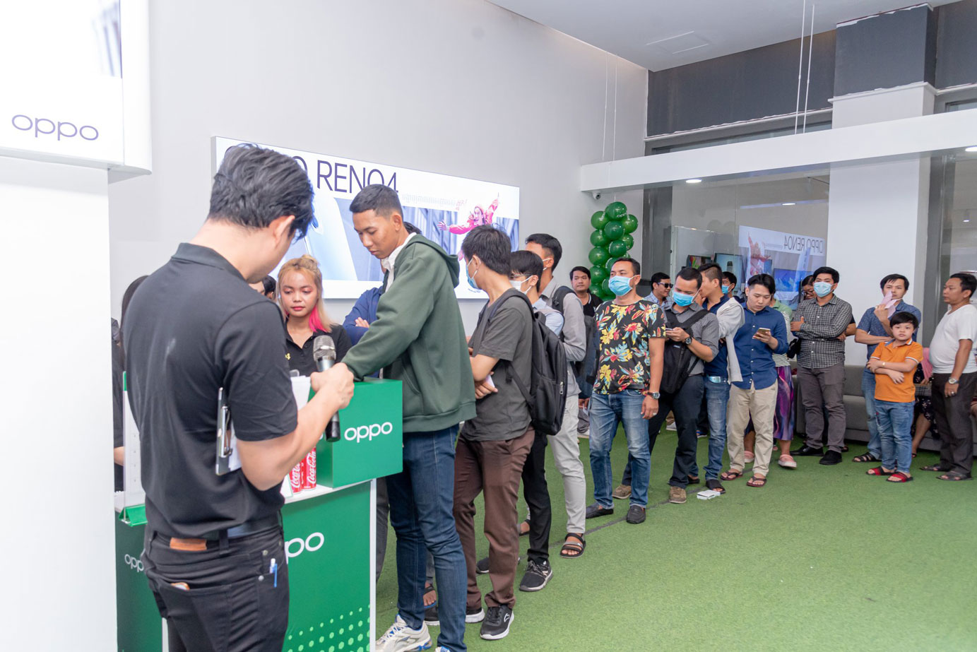 នេះគឺជាទិដ្ឋភាពដែលអតិថិជនជាច្រើន ដែលបានធ្វើការកក់ទុកមុន (Pre Order) អញ្ជើញមកទទួលយកស្មាតហ្វូន OPPO Reno4 ក្នុងថ្ងៃដំបូង!