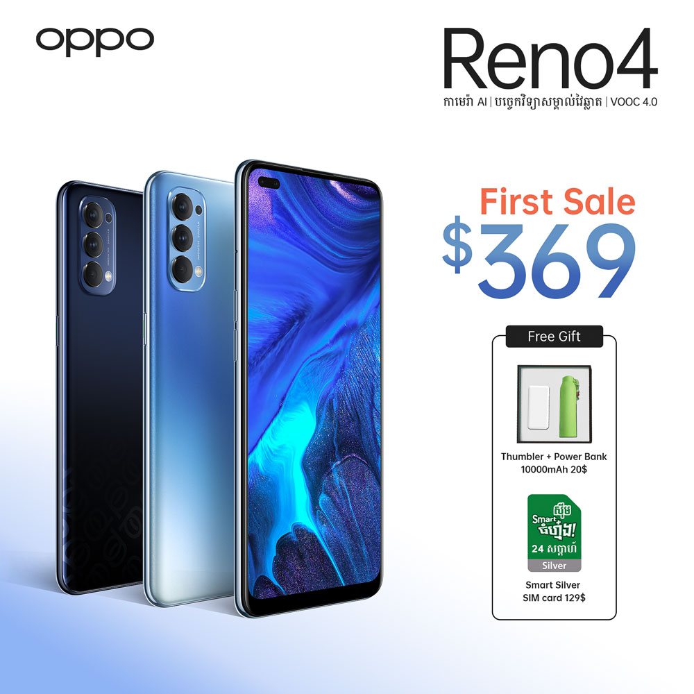 OPPO Reno4 ផ្ទុះការគាំទ្រ កក្រើក ក្នុងថ្ងៃលក់ដំបូង! ខ្លាំងគ្រប់ចំណុច ទាំងកាមេរ៉ា AIទាំងបច្ចេកវិទ្យាថ្មីប្លែក ទាំងរូបរាងពណ៌ឆើត ពិសេសតម្លៃត្រូវចិត្តត្រឹមតែ $369 ធានាថាគ្មានស្មាតហ្វូនណាមកប្រដូចបាន