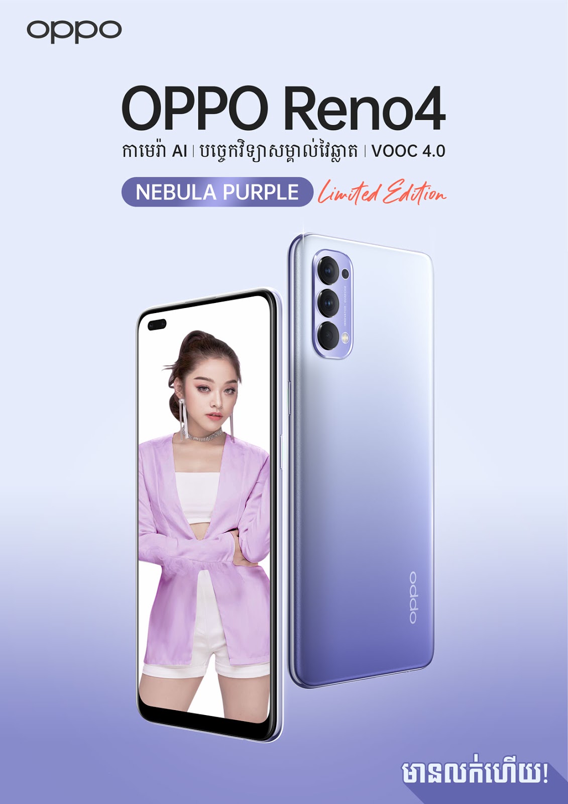 ជាក់ស្តែង បន្ទាប់ពីមានការប្រកាសលក់ OPPO Reno4 ដែលមានជម្រើស ២ពណ៌សម្រាប់ជ្រើសរើសគឺ Space Black និង Galactic Blue លក់ដាច់ខ្លាំង ស្ទើរតែផ្ទុះទីផ្សារស្មាតហ្វូនតែម្តង ហើយក៏ជាភាពជោគជ័យទើបក្រុមហ៊ុន OPPO សម្រេចចិត្តនាំយកស្មាតហ្វូន OPPO Reno4 ពណ៌ Nebula Purple ដ៏ថ្មីស្រឡាង ដើម្បីផ្គាប់ចិត្ត និងបំពេញចិត្តអតិថិជនផងដែរ។ ជាពិសេសគឺពណ៌នេះពេញនិយមខ្លាំងសម្រាប់មិត្តៗយុវវ័យ ចាប់កាន់ក្នុងដៃយ៉ាងទាន់សម័យ ពិសេសសម្រាប់ពណ៌ថ្មីនេះគឺធានាថាត្រូវចិត្តមិត្តស្រីៗហ្មង៎ ដែលជាពណ៌កម្រ និងអាចទិញជាកាដូពិសេសសម្រាប់គូស្នេហ៍ ឬដៃគូ។ ប៉ុន្តែសូមបញ្ជាក់ថា សម្រាប់ពណ៌ថ្មីនេះចំនួនមានកំណត់ (Limited Edition)។ ដូច្នេះអតិថិជនមកមុនគឺនឹងក្លាយជាម្ចាស់ពណ៌ថ្មីនេះ បើមកក្រោយគឺធានាថាប្រាកដជាអត់ហើយ។