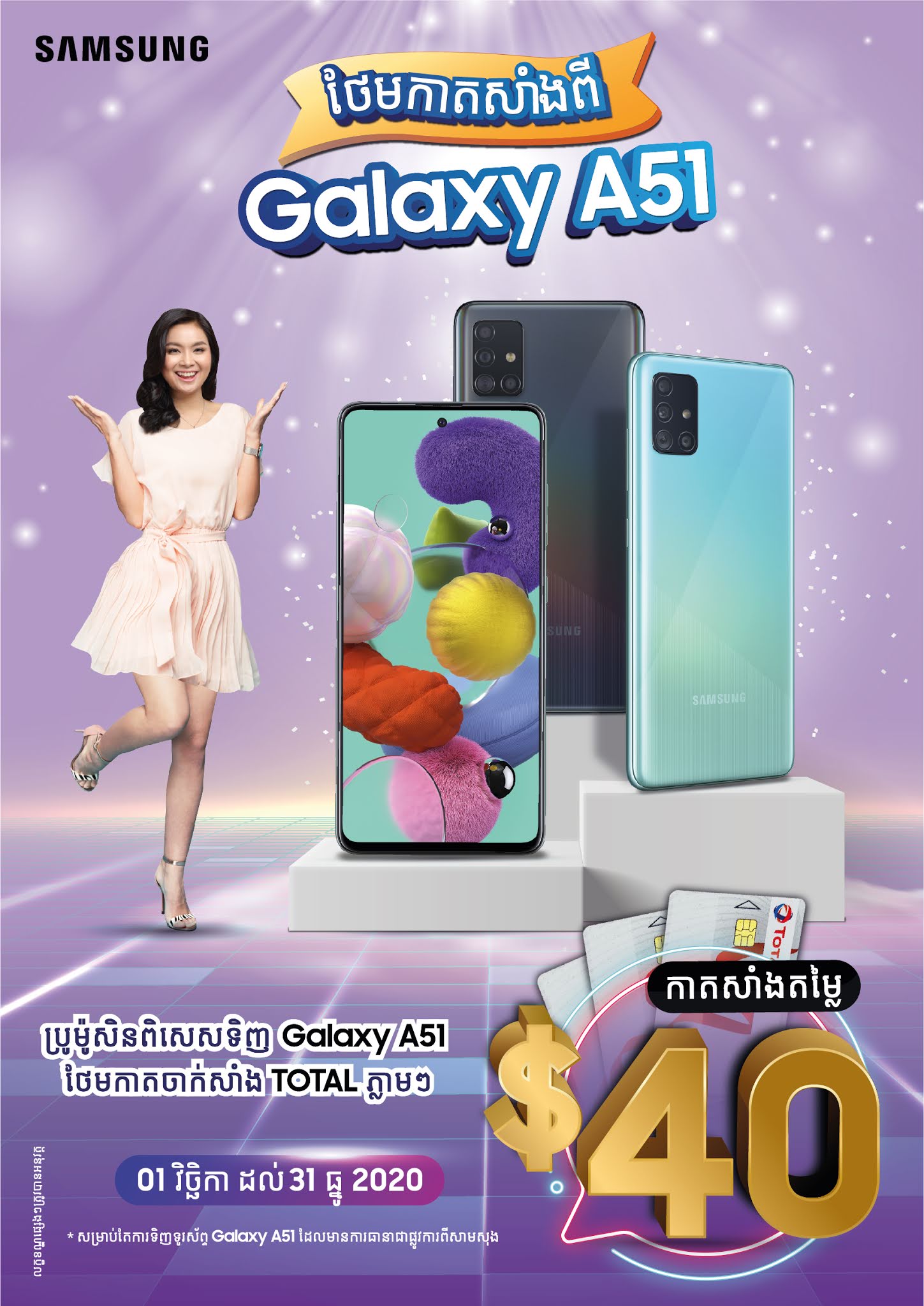 (ភ្នំពេញ) ថ្ងៃទី ០៣ ខែវិច្ឆិកា ឆ្នាំ ២០២០៖ ប្រូម៉ូសិនដ៏រំភើបរីករាយ និងអស្ចារ្យបានមកដល់ទៀតហើយ…!! រាល់ការទិញ Samsung Galaxy A51 ចាប់ពីថ្ងៃទី 01 រហូតដល់ថ្ងៃទី 31 ខែធ្នូ ឆ្នាំ 2020 អតិថិជនទាំងអស់នឹងទទួលបានការថែមជូនកាតចាក់សាំង តូតាល់ (TOTAL) តម្លៃ $40 ហ្វ្រីៗភ្លាមៗតែម្តង…!! ឡូយហ្អេ៎…!! ពិតជាឡូយ…ហើយចំណេញច្រើនទៀត…!! ស្រឡាញ់ សាមសុង ពេញបេះដូងម៉ង!!