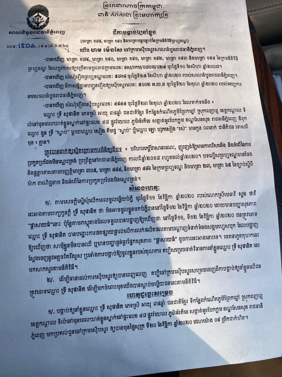 ការចាប់ខ្លួននេះ បានធ្វើឡើងតាមដីកាបង្គាប់ឲ្យចាប់ខ្លួនរបស់លោក ហម ម៉េងសែ អនុប្រធាន និងជាចៅក្រមសើបសួរសាលាដំបូងរាជធានីភ្នំពេញ។