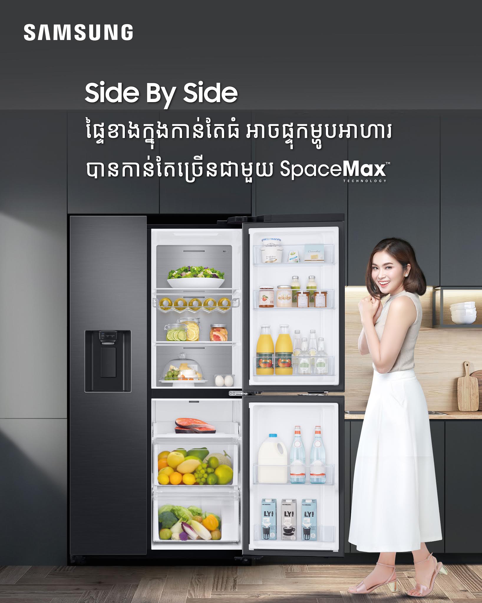 ទូទឹកកក Side By Side បច្ចេកវិទ្យា SpaceMax ផ្ទៃខាងក្នុងទំហំធំ ទូលាយ ផ្ទុកអាហារបានច្រើន សន្សំសំចៃពេលវេលា បង្កើនការរស់នៅឱ្យកាន់តែមានសុភមង្គលគ្រប់ក្រុមគ្រួសារ! តោះ…នៅចាំអីទៀត…ប្រញាប់ទិញមួយគ្រឿងសម្រាប់គេហដ្ឋានឥឡូវនេះភ្លាមទៅ…!!