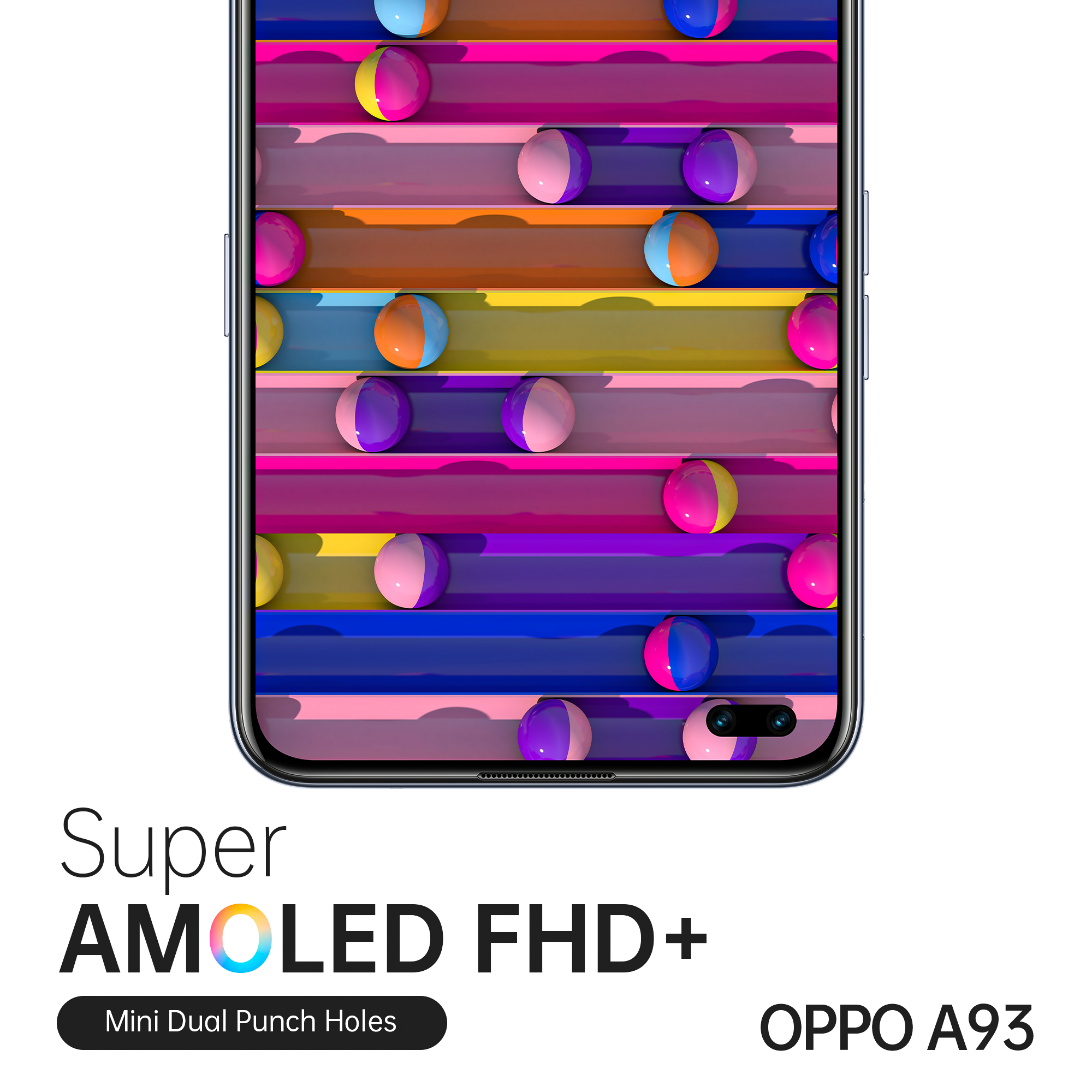 អេក្រង់៖ OPPO A93 ជាស្មាតហ្វូនអេក្រង់ភ្លោះមុខ 6.43” Super AMOLED ដែលបង្ហាញនូវកម្រិតរូបភាពភ្លឺច្បាស់ ងាយស្រួលក្នុងការលេងហ្គេម និងរលូនដោយមិនប៉ះពាល់ដល់សុខភាពភ្នែក ថែមទាំងទទួលស្គាល់ដោយស្ថាប័ន TUV Rheinsland Certified ទៀតផង។