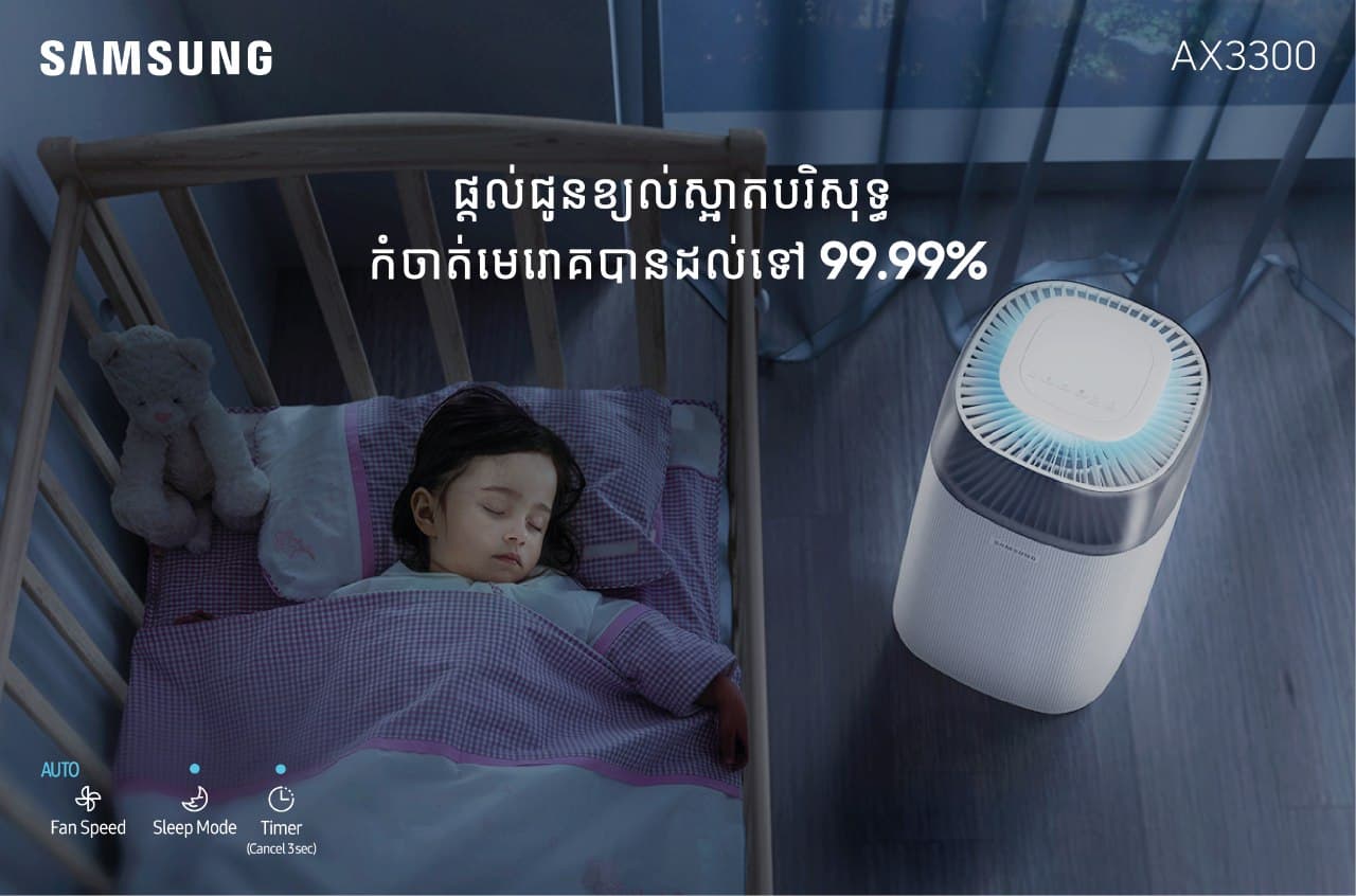 ជាក់ស្តែងនៅថ្ងៃនេះដើម្បីឆ្លើយតបទៅនឹងតម្រូវការក៏ដូចជាធ្វើឱ្យគុណភាពជីវិតរបស់អតិថិជនព្រមទាំងមនុស្សជាតិទាំងអស់ទូទាំងពិភពលោកកាន់តែមានភាពងាយស្រួល មានផាសុកភាព និងកាន់តែប្រសើរនោះ…ក្រុមហ៊ុន សាមសុង ក៏បានបញ្ចេញនូវម៉ាស៊ីនបន្សុទ្ធខ្យល់ Samsung Air Purifier AX3300 ដែលមានគុណភាពខ្ពស់…ទំនើបទាន់សម័យ និងមានប្រសិទ្ធភាពបំផុតក្នុងការកម្ចាត់ មេរោគ…ធូលី…បាក់តេរី និងភាគលិ្អតតូចៗក្នុងខ្យល់ដែលបង្កជាជំងឺផ្សេងៗបានរហូតដល់ 99.99% និងផ្តល់ជូននូវខ្យល់បរិសុទ្ធល្អបំផុតសម្រាប់សុខភាព!