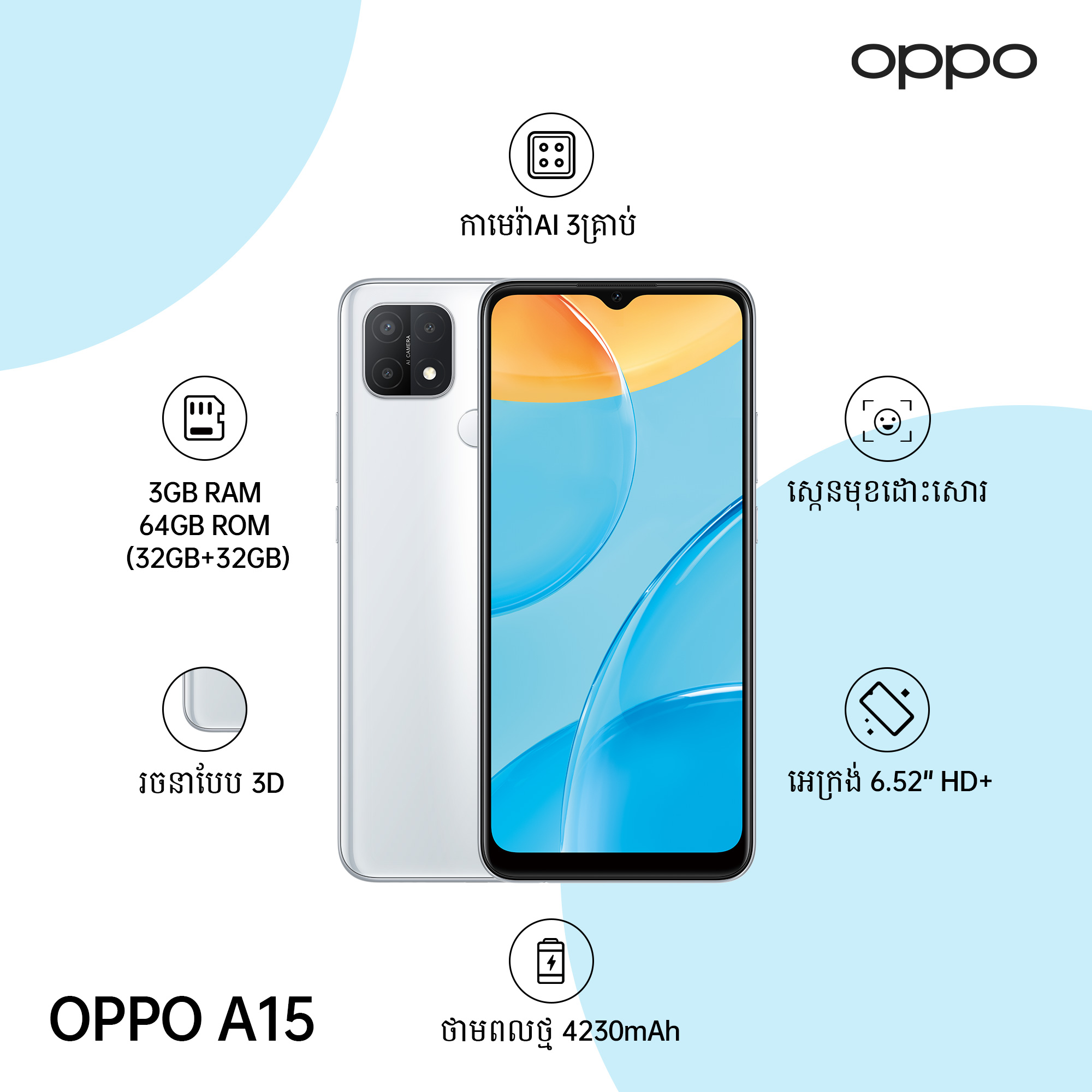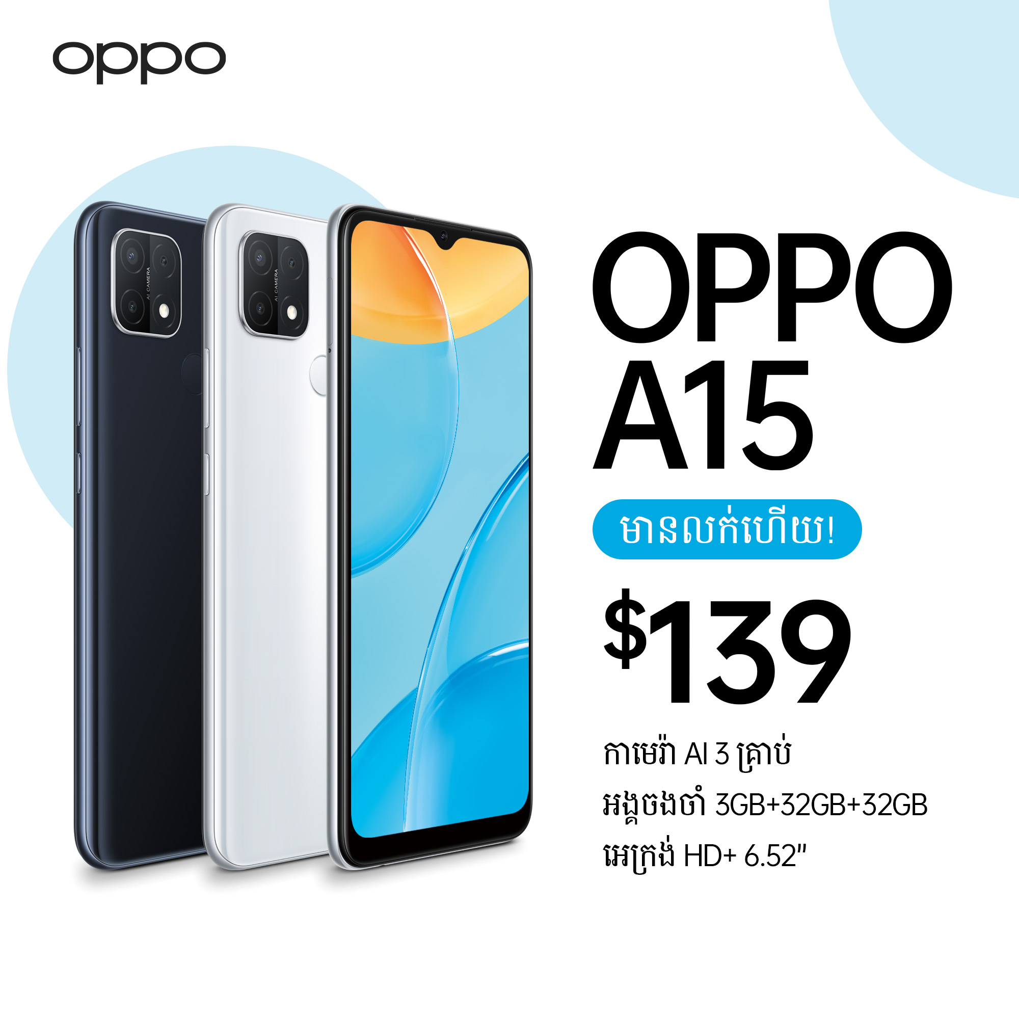 ឆ្ងល់អត់? ហេតុអ្វីទើបស្មាតហ្វូន OPPO A15 ទទួលបានការចាប់អារម្មណ៍ខ្លាំងយ៉ាងនេះ? អាចនិយាយបានថា នេះគឺទូរស័ព្ទតែមួយគត់ មានទាំងកាមេរ៉ា AI 3 គ្រាប់, អេក្រង់ HD+ 6.52″, RAM 3GB និង ROM 64GB ថែមទៀត ក្នុងតម្លៃត្រឹមតែ $139 តែប៉ុណ្ណោះ។