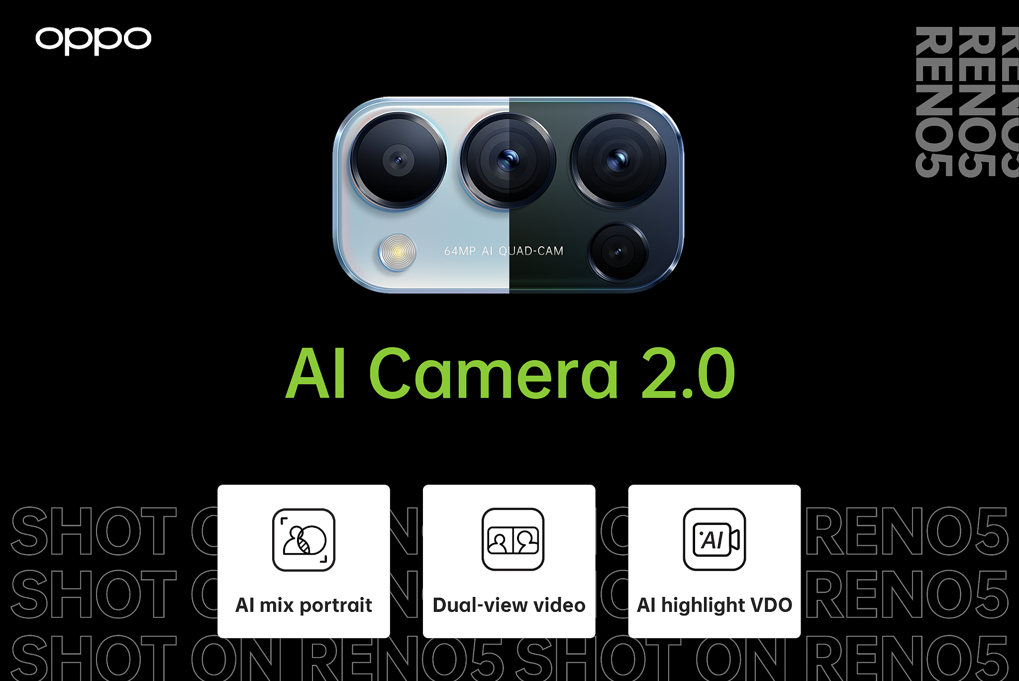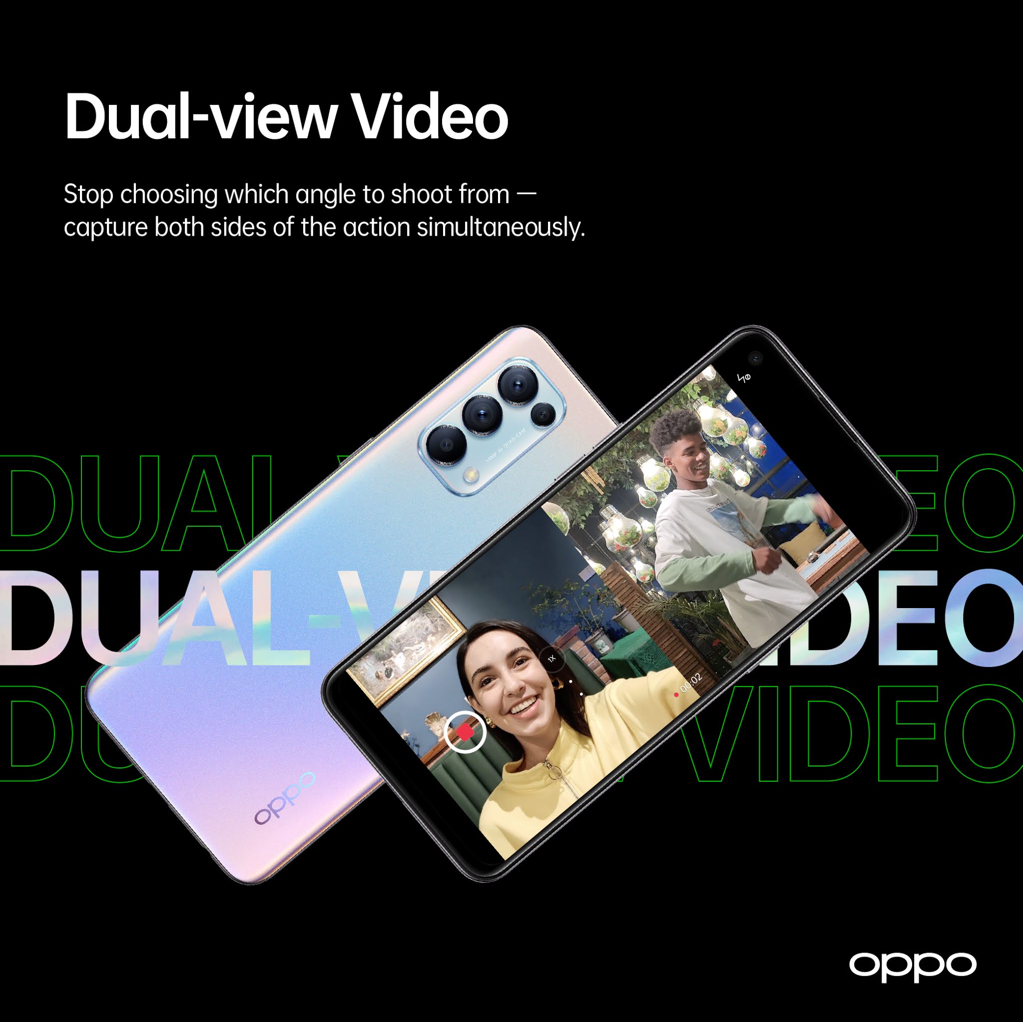 នៅក្នុងគ្រួសារតូចមួយ ពេលសមាជិកមានកូនភ្លោះ គឺជារឿងមួយដែលសប្បាយចិត្ត រំភើប ភ្ញាក់ផ្អើល ហើយក៏ជារឿងដែលចៃដន្យ និងកម្រកើតមានផងដែរ។ រីឯបច្ចេកវិទ្យាវិញក៏ដូចគ្នាលើកនេះ OPPO Reno5 កំណែទម្រង់អាប់ដេតនូវ AI Camera ជំនាន់ 2.0 ដោយបំពាក់មក Dual View Video គឺជាមុខងារដែលអាចថតចេញពីកាមេរ៉ាមុខ និងកាមេរ៉ាក្រោយបានក្នុងពេលតែមួយ ឬហៅថា វីដេអូភ្លោះ។