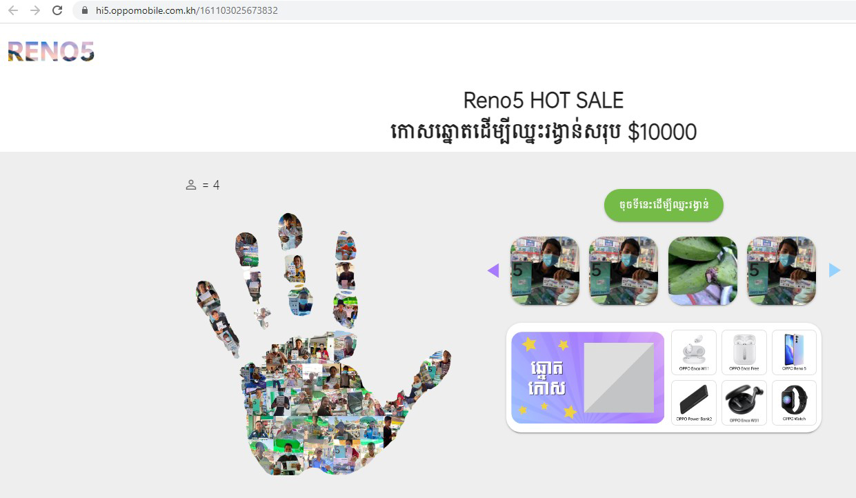 ពិសេសជាងនេះទៅទៀត រាល់ការជាវស្មាតហ្វូន OPPO Reno5 ចាប់ពីថ្ងៃទី23 ខែមករា នេះតទៅ រាល់អតិថិជនទាំងអស់នឹងមានឱកាសផ្សងសំណាង កោសឆ្នោតដើម្បីឈ្នះរង្វាន់សរុប $10000 តាម Online ចំនួន 2 ដងដោយគ្រាន់តែរូបថតលោកអ្នកដែលថតជាមួយ OPPO RENO5 បង្ហោះចូលក្នុងវេបសាយ រួចវាយលេខ IMEI ទូរស័ព្ទ OPPO RENO5 នោះលោកអ្នកអាចមានឱកាសឈ្នះរង្វាន់ម្តង រួចលោកអ្នកធ្វើការ Share លើបណ្តាញសង្គម Facebook នឹងមានឱកាសបានកោសផ្សងសំណាងជាលើកទី2 ដើម្បីទទួលបានរង្វាន់កាន់តែច្រើនបន្ថែមពីកាដូដែលក្រុមហ៊ុន OPPO បានផ្តល់ជូនថែមទៀត។