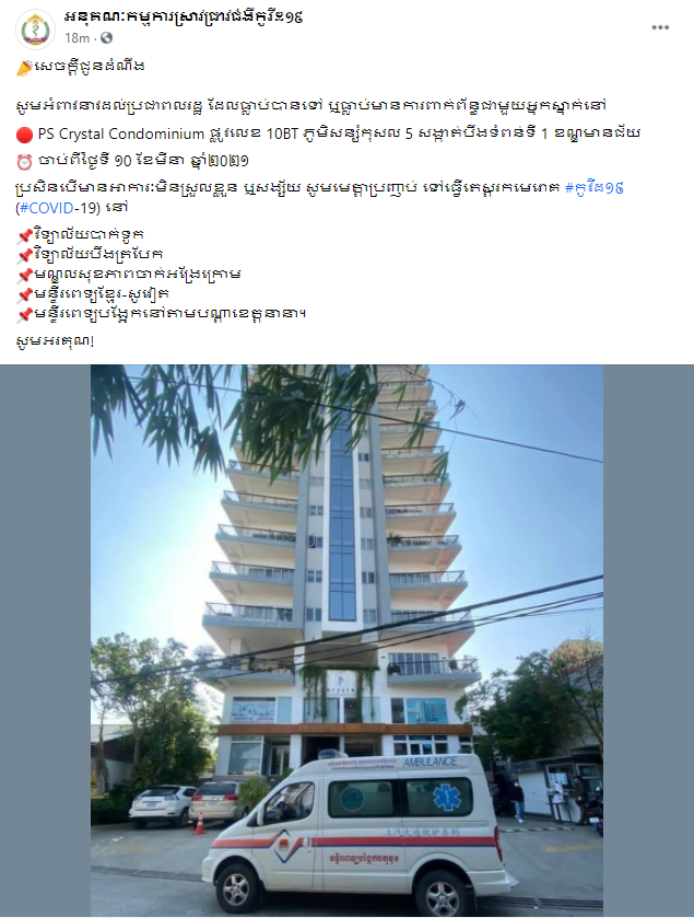 យោងតាមផេកផ្លូវការរបស់ អនុគណៈកម្មការស្រាវជ្រាវជំងឺកូវីដ-១៩ ចុះផ្សាយកាលពីប៉ុន្មានម៉ោងមុននេះ បានអំពាវនាវដល់ប្រជាពលរដ្ឋ ដែលធ្លាប់បានទៅកាន់ ឬធ្លាប់បានពាក់ព័ន្ធជាមួយអ្នកស្នាក់នៅ អគារខុនដូ PS Crystal Condominium ដែលមានទីតាំងស្ថិតនៅផ្លូវលេខ ១០BT ភូមិសន្សំកុសល៥ សង្កាត់បឹងទំពន់ទី១ ខណ្ឌមានជ័យ រាជធានីភ្នំពេញ ចាប់ពីថ្ងៃទី១០ ខែមីនា ឆ្នាំ២០២១នេះ ប្រញាប់ទៅធ្វើតេស្ដជាបន្ទាន់ ប្រសិនបើមានអាការមិនស្រួលខ្លួន ឬសង្ស័យក្នុងសញ្ញាដែលក្រសួងប្រកាស។