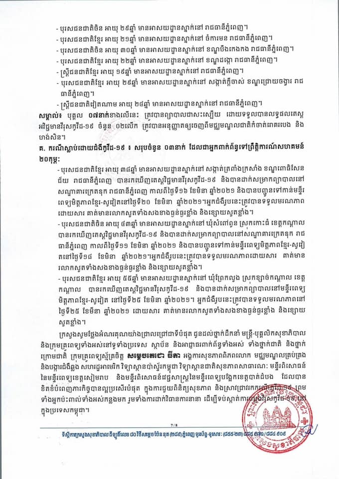 គួរបញ្ជាក់ផងដែរថា បើគិតមកទល់ពេលនេះ ប្រទេសកម្ពុជារកឃើញអ្នកឆ្លងជំងឺកូវីដ១៩ សរុបចំនួន ១៩៦៨នាក់ អ្នកជាសះស្បើយ ១០៧៤នាក់ អ្នកកំពុងសម្រាកព្យាបាលជំងឺ ចំនួន ៨៨៤នាក់ និងស្លាប់បាត់បង់ជីវិត៨នាក់ផងដែរ៕