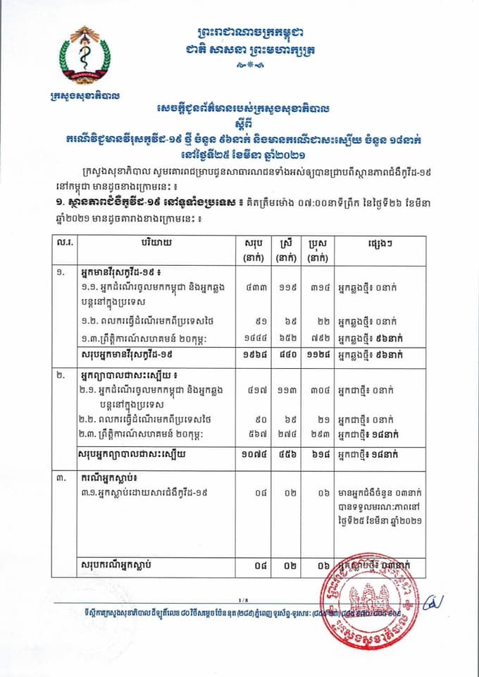 យោងតាមការចុះផ្សាយរបស់ក្រសួងសុខាភិបាល នៅមុននេះបន្ដិច បានចេញសេចក្តីប្រកាសព័ត៌មាន បញ្ជាក់ពីការបន្តរកឃើញអ្នកឆ្លងកូវីដ១៩ ថ្មី នៅក្នុងថ្ងៃទី២៦ ខែមីនា ឆ្នាំ២០២១នេះ មានរហូតដល់៩៦នាក់ ក្នុងនោះសុទ្ធសឹងជាករណីឆ្លងក្នុងសហគមន៍ «ព្រឹត្តិការណ៍២០កុម្ភៈ» ខណៈអ្នកជំងឺចំនួន១៨នាក់បានជាសះស្បើយផងដែរ។