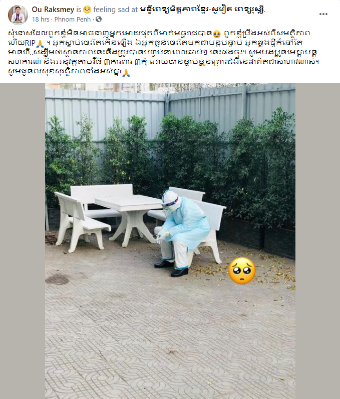 «សុំទោសដែលពួកខ្ញុំមិនអាចទាញអ្នកអោយផុតពីមាត់មច្ចុរាជបាន ពួកខ្ញុំប្រឹងអស់ពីសមត្ថភាពហើយRIP។ អ្នកស្លាប់ចេះតែកើនឡើង ឯអ្នកធ្ងន់ចេះតែមកជាបន្តបន្ទាប់ អ្នកឆ្លងថ្មីក៏នៅតែមានហឺ..សង្ឃឹមថាស្ថានភាពនេះនឹងត្រូវបានបញ្ចប់នាពេលឆាប់ៗ នេះផងចុះ។ សូមបងប្អូនមេត្តាបន្តសហការណ៍ និងអនុវត្តតាមវីធី ៣ការពារ ៣កុំ អោយបានខ្ជាប់ខ្ជួនព្រោះជំងឺនេះវាពិតជាសាហាវណាស់។ សូមជូនពរសុខសុវត្ថិភាពទាំងអស់គ្នា»៕