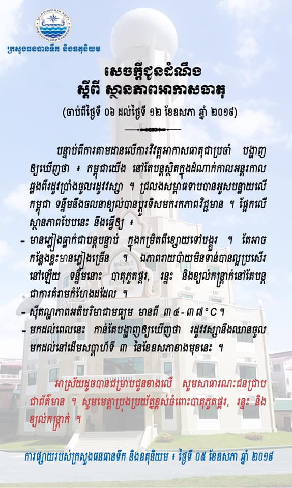 យោងតាមការចេញផ្សាយព័ត៌មានរបស់ក្រសួងធនធានទឹក និងឧតុនិយមកាលពីព្រឹកថ្ងៃទី៥ ខែឧសភា ឆ្នាំ២០១៩ បង្ហាញថា អាកាសធាតុកម្ពុជាបច្ចុប្បន្នកំពុងស្ថិតនៅក្នុងអន្ដរកាល ដំណាក់កាលឆ្លងពីរដូវប្រាំងចូលរដូវវស្សា។