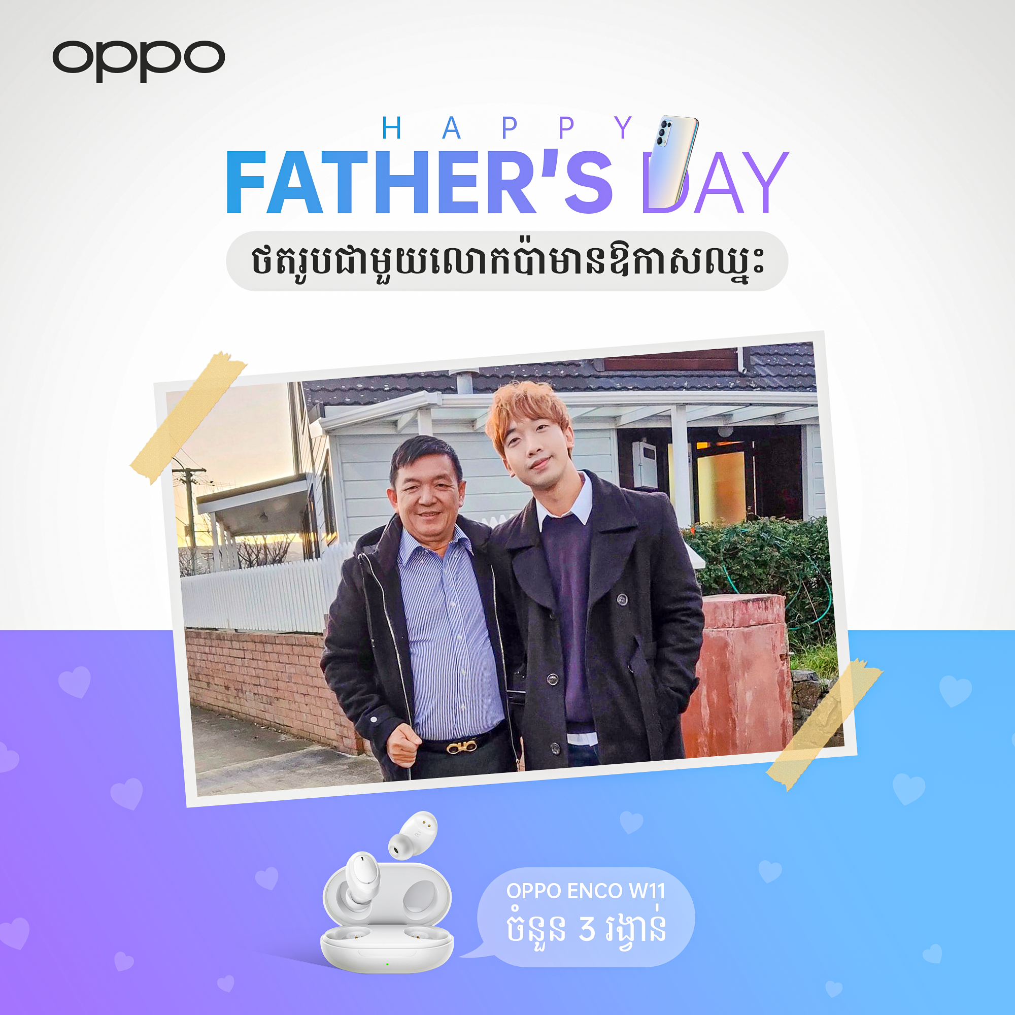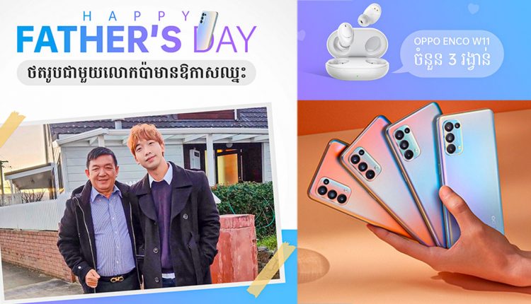 ហើយកាន់តែពិសេស ឆ្លៀតក្នុងឱកាស «ទិវាគុណឪពុក» ក្រុមហ៊ុនស្មាតហ្វូន OPPO បានរៀបចំកម្មវិធីប្រកួតថតរូបជាមួយលោកឪពុកជាទីស្រលាញ់របស់អ្នកក្នុងការអបអរ Father’s Day ដើម្បីមានឱកាសទទួលបានរង្វាន់កាសឥតខ្សែ OPPO Enco W11 ចំនួន 3 គ្រឿងផងដែរ។ ដោយគ្រាន់តែថតរូបជាមួយឪពុករបស់អ្នក រួចបង្ហោះលើគណនីហ្វេសប៊ុកផ្ទាល់ខ្លួន។ សម្រាប់ព័ត៌មានលម្អិតអាចចូលទៅកាន់តំណរភ្ជាប់ (Link) មួយនេះ ៖