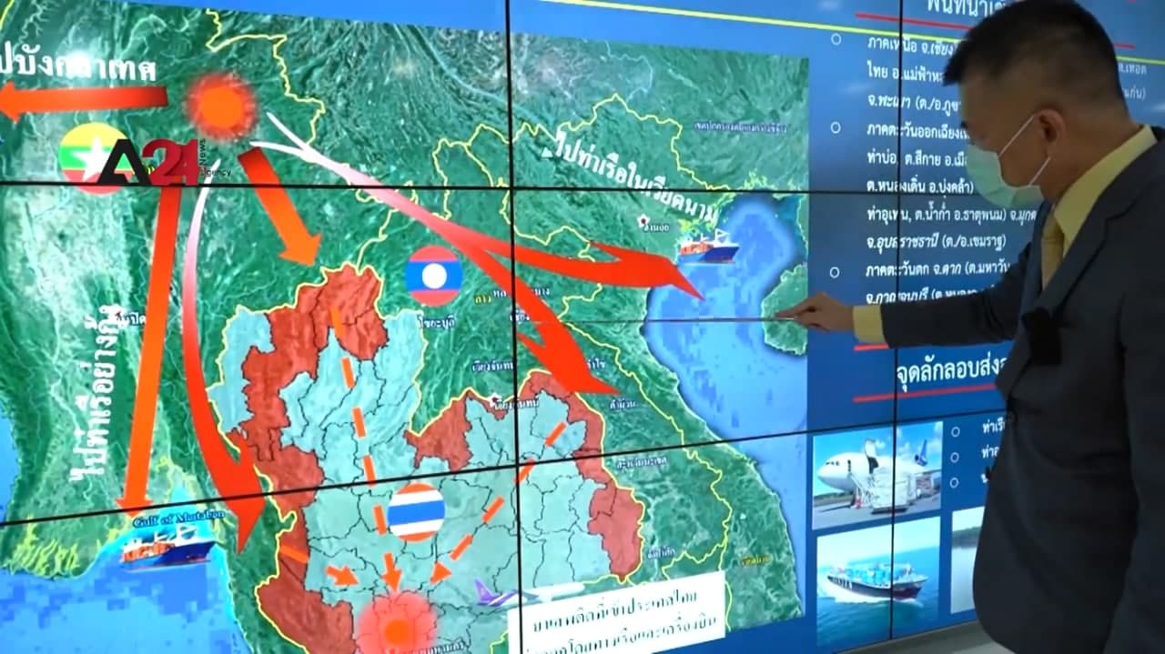 លោក វីឆៃ ឆៃម៉ុងឃុន អគ្គនាយករង ការិយាល័យនៃគណៈគ្រប់គ្រងគ្រឿងញៀន បានអោយដឹងថា ៖ ផ្លូវទីមួយគឺពី ប្រទេសមីយ៉ាន់ម៉ា ទៅ ខេត្តតាក់ ប្រទេសថៃ។ ផ្លូវទីពីរចាប់ផ្តើមពីឈៀងម៉ៃឬឈៀងរ៉ាយភាគខាងជើងរបស់យើងឆ្លងកាត់ពាក់កណ្តាលទៅទីក្រុងបាងកក មុនពេលបញ្ជូនទៅភាគខាងត្បូងឬក្នុងករណីដែលនៅបរទេសវាដំណើរការតាមរយៈកំពង់ផែឬអាកាសយានដ្ឋានរបស់យើង។ ផ្លូវចុងក្រោយគឺមកពីប្រទេសឡាវ ទៅណុកខៃណាខន ហើយបន្ទាប់មក បន្តដំណើរទៅបាងកក។