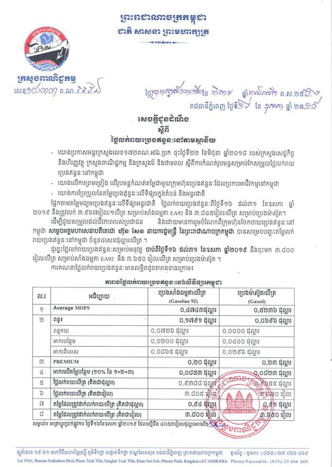 ក្នុង​សេចក្តីជូន​ដំណឹង​មួយ​ចុះ​ផ្សាយ​នៅ​ថ្ងៃនេះ​ ក្រ​សួង​ពាណិជ្ជកម្ម​ឲ្យ​ដឹងថា ​តម្លៃ​ប្រេងសាំងធម្មតា​លក់​រាយ​ក្នុង​មួយ​លីត្រ​ថ្លៃ​៣៨០០​រៀល ចុះ​១៥០​រៀល បើ​ធៀបទៅ​នឹង​កន្លះខែមុន ខណៈប្រេងម៉ាស៊ូត​តម្លៃ​៣៦៥០​រៀល​ ចុះបាន​៥០​រៀល​បើធៀបទៅនឹង​កន្លះខែមុន​ដូចគ្នា​។​