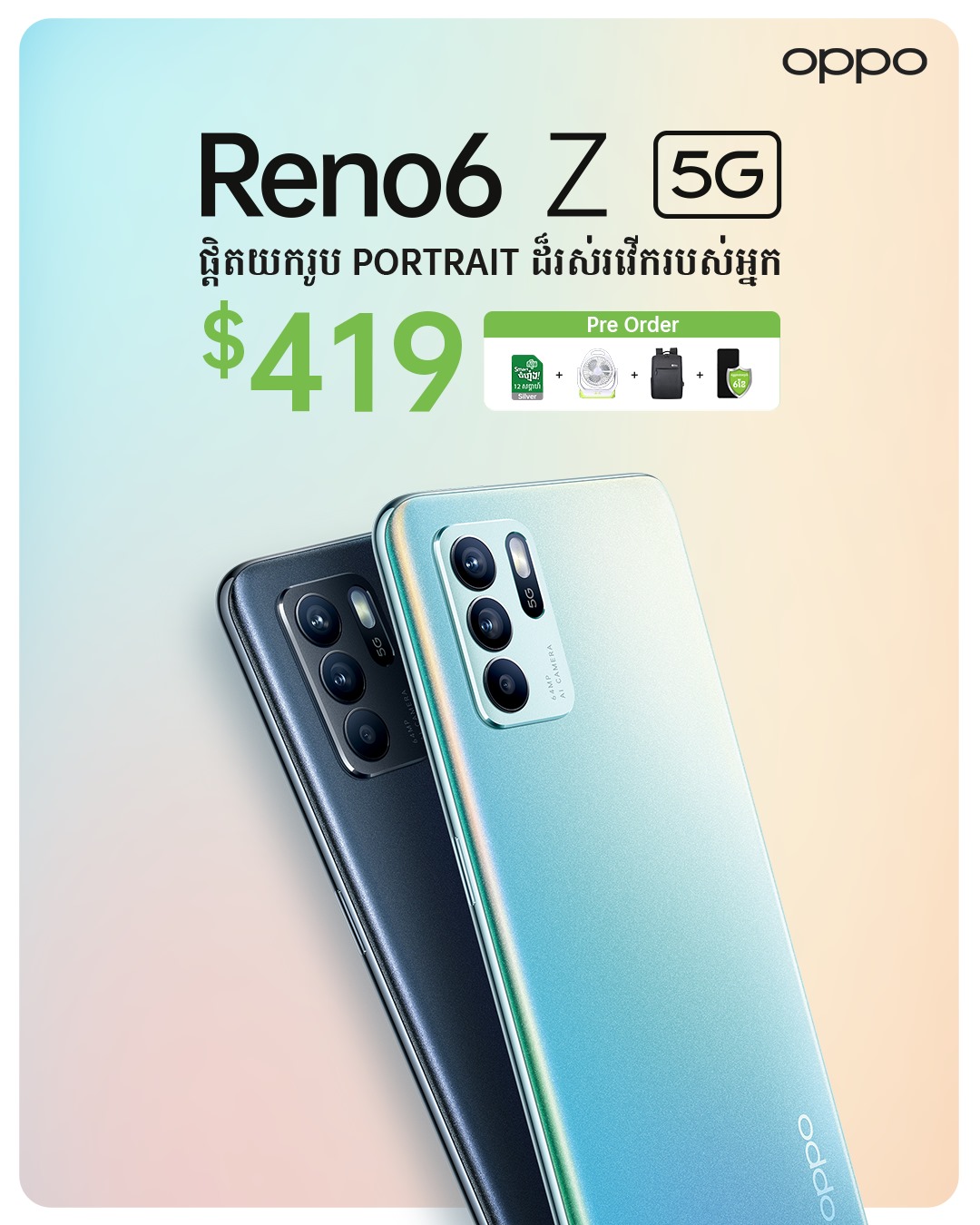 បន្ទាប់ពីបានជ្រាបច្បាស់ពីលក្ខណៈពិសេសខ្លះៗរួចមកហើយព្រមទាំងមុខងារថ្មី «វីដេអូតាមចាប់គោលដៅ» រួចមក តើអ្នកទាំងអស់គ្នាយល់យ៉ាងណាដែរ ចំពោះមុខងារថ្មីលើស្មាតហ្វូន OPPO Reno6 Z 5G? យើងសង្កេតឃើញថា OPPO តែងតែអាប់ដេតអ្វីថ្មីៗនិងប្លែកៗជានិច្ច ពិសេសនៅលើ Reno Series របស់ខ្លួន ដែលមិនធ្វើឲ្យហ្វេនៗ ព្រមទាំងអតិថិជនខ្លួនខកបំណងឡើយគួបផ្សំជាមួយនឹងតម្លៃត្រឹមតែ $419 ដូច្នេះបងប្អូនអតិថិជនអស់គ្នាអាចធ្វើការកក់ទុកមុន (Pre Order) បានចាប់ពីថ្ងៃនេះដល់ថ្ងៃទី07 ខែសីហា នៅគ្រប់បណ្តាហាងលក់ទូរស័ព្ទទូទាំងប្រទេស ដែលមានផ្លាក OPPO នឹងទទួលបានកញ្ចប់កាដូ Pre Order ដែលមានតម្លៃរហូតដល់ទៅ $197 រួមមានដូចជា៖ កង្ហារ (តម្លៃ $39), កាតាបស្ពាយដ៏ស្រស់ស្អាត (តម្លៃ ($29), ប័ណ្ណធានាអេក្រង់រយៈពេល 6 ខែ, និងស៊ីមស្មាតលេខពិសេស Silver (តម្លៃ $129) ភ្ជាប់ជាមួយគម្រោង Smart ធំហ្មង៎រយៈពេល 12 សប្តាហ៍។ តោះប្រញាប់ Pre Order ស្មាតហ្វូន OPPO Reno6 Z 5G ឲ្យបានមុនគេ ដើម្បីទទួលបានកាដូជាច្រើន ពិសេសបានចាប់កាន់ Reno6 Z 5G មុនគេទៀត!