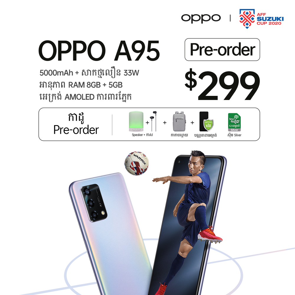 ប្រសិនលោកអ្នកមានចំណាប់អារម្មណ៍ Pre-Order ឬកក់ទុកមុន OPPO A95 តម្លៃ $299 ចាប់ពីថ្ងៃនេះដល់ថ្ងៃទី27 ខែវិច្ឆិកា ឆ្នាំ2021 ដោយគ្រាន់តែអញ្ជើញទៅកាន់គ្រប់បណ្តាហាងលក់ទូរស័ព្ទដែលមានផ្លាក OPPO ទូទាំងប្រទេស ដើម្បីទទួលបានព័ត៌មានលម្អិតអំពីការកក់ទុកមុន ពិសេសនឹងទទួលបានកាដូគាប់ចិត្តសរុបជាទឹកប្រាក់ $232 រួមមាន ៖ Speaker + កាស (តម្លៃ $19), កាតាបស្ពាយក្រោយ (តម្លៃ $25), ប័ណ្ណធានាអេក្រង់ (តម្លៃ $59) និងស៊ីម Silver(តម្លៃ $129) ភ្ជាប់គម្រោង Smart ធំហ្មង៎ 12 សប្តាហ៍។ សម្រាប់ព័ត៌មានបន្ថែមសូមចូលទៅកាន់ផេគហ្វ៊េសប៊ុកផ្លូវការរបស់ក្រុមហ៊ុន OPPO៕
