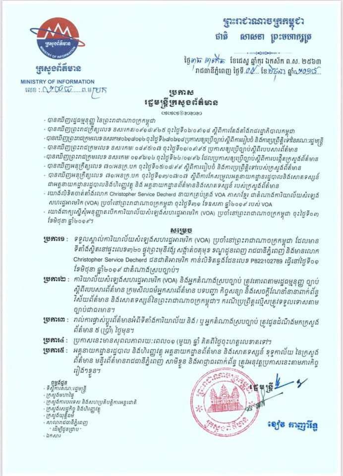 ការិយាល័យសំឡេងសហរដ្ឋអាមេរិក (VOA) និងអ្នកតំណាងស្របច្បាប់ ត្រូវគោរពតាមរដ្ឋធម្មនុញ្ញ ច្បាប់ស្តីពីរបបសារព័ត៌មាន ក្រមសីលធម៌អ្នកសារព័ត៌មាន បទបញ្ជា កិច្ចសន្យា នឹងសេចក្តីណែនាំនានាពាក់ព័ន្ធវិស័យព័ត៌មាន និងសោតទស្សន៍នៃព្រះរាជាណាចក្រកម្ពុជា។ ករណីប្រព្រឹត្តល្មើសត្រូវទទួលទោសតាមច្បាប់ជាធរមាន។ នេះបើតាមការបញ្ជាក់របស់ក្រសួងព័ត៌មាន ក្នុងប្រកា២ នៃសេចក្តីសម្រេចខាងលើនេះ។ មិនតែប៉ុណ្ណោះ ក្រសួងក៏បានតម្រូវឱ្យ ការិយាល័យវិទ្យុសំឡេងសហរដ្ឋអាមេរិក គឺរាល់ការផ្លាស់ប្តូរព័ត៌មានអំពីទីតាំងការិយាល័យ ឬ អ្នកតំណាងស្របច្បាប់ ត្រូវជូនដំណឹងមកក្រសួងព័ត៌មាន៥ (ប្រាំ) ថ្ងៃមុន។