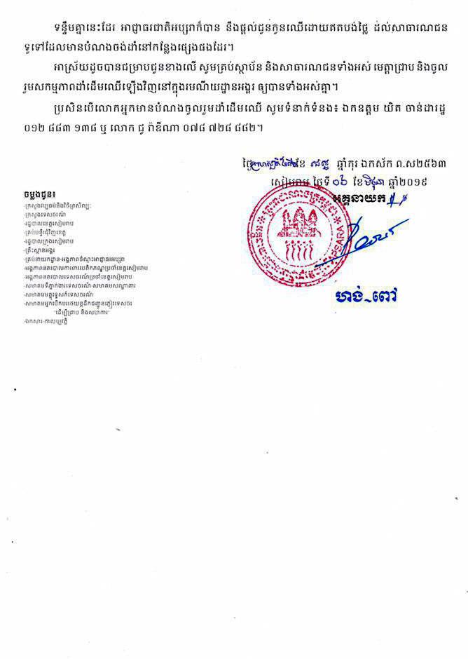 ដើម្បីចូលរួមក្នុងយុទ្ធនាការដាំដើមឈើនៅក្នុងរមណីយដ្ឋានអង្គរ សូមទំនាក់ទំនងលោក យិត ចាន់ដារដ្ឋ ០១២ ៨៨៣ ១៣៨ ឬលោក ជូ រ៉ាឌីណា ០៧៨ ៧២៨ ៨៨២៕