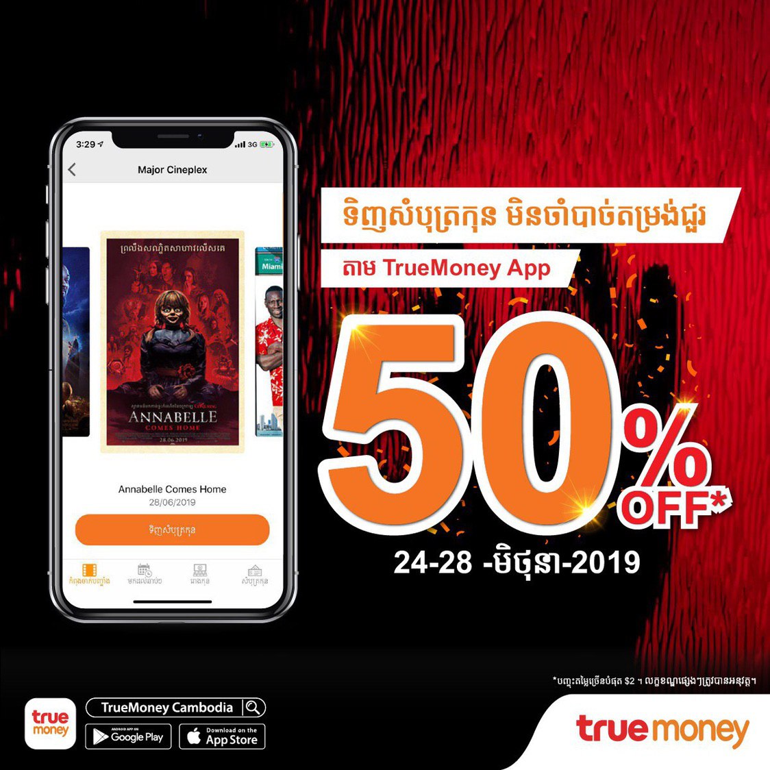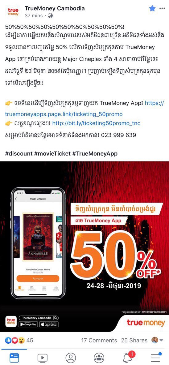 ចឹងនៅចាំអីទៀតទៅរីករាយទាំងអស់គ្នាជាមួយការទិញសំបុត្រកុនបញ្ជុះតម្លៃ ៥០% តាម TrueMoney App ទាំងអស់គ្នាកុំឲ្យហួសពេល ជាពិសេសទិញទុកក៏បាន។