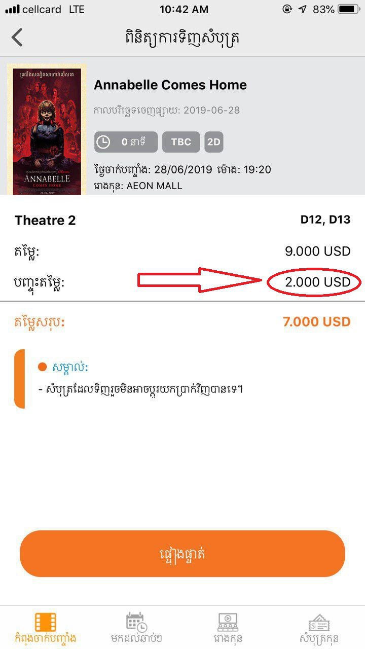 នេះជាដំណឹងពិសេសមួយសម្រាប់អ្នកចូលចិត្តមើលកុន ព្រោះថាចំណញច្រើនហើយងាយស្រួលទៀត ដែលអតិថិជនទាំងអស់នឹងទទួលបានការបញ្ចុះតម្លៃដល់ទៅ ៥០% លើគ្រប់ប្រភេទសំបុត្រកុន គ្រប់ម៉ោង គ្រប់រឿង ចាប់ពីថ្ងៃនេះតទៅរហូតដល់ថ្ងៃទី28 មិថុនា។