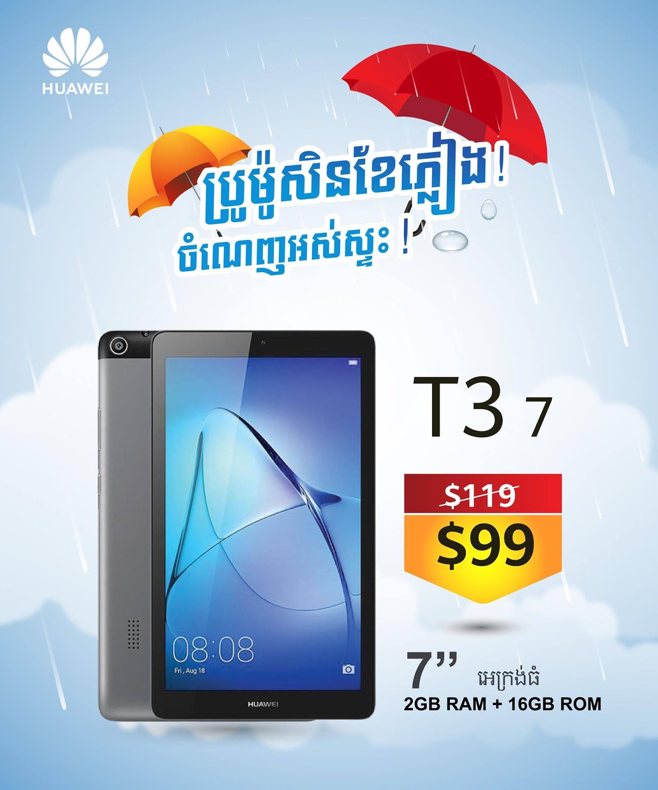 - Huawei T3 7 ៖ ចំណេញបាន $20 ដែលតម្លៃនៅសល់ត្រឹមតែ $99 ជា Tablet អេក្រង់ទំហំ 7 អ៊ីញ RAM 2GB និង ROM 16GB